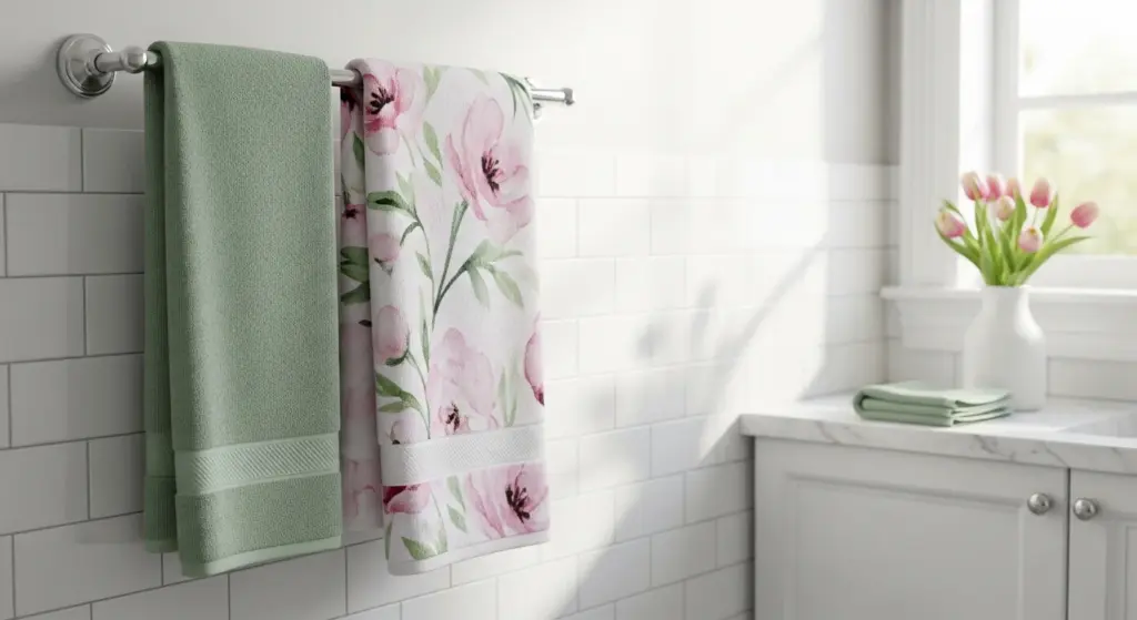 - Visual Cues: A three-tier stack on a towel bar using monochromatic shades or contrasting spring patterns.