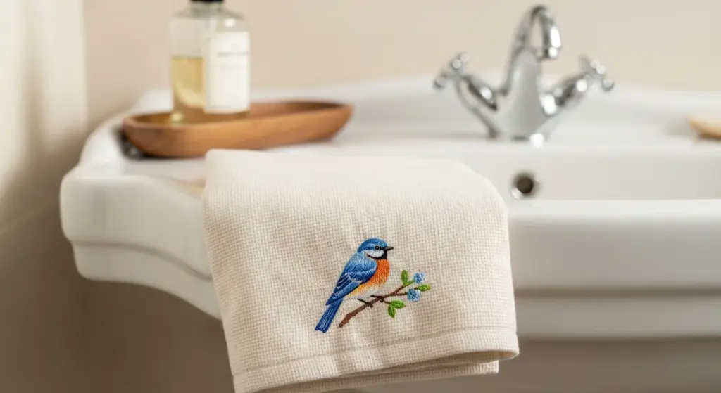 - Visual Cues: Small, detailed bird embroidery on linen or cotton hand towels, often paired with wooden accessories.