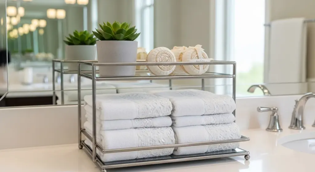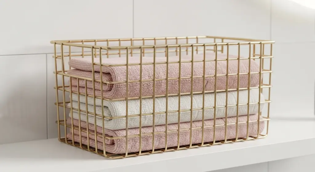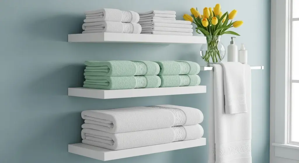 - Visual Cues: Horizontal stacks of towels, clear shelf lines, and small seasonal decor accents.