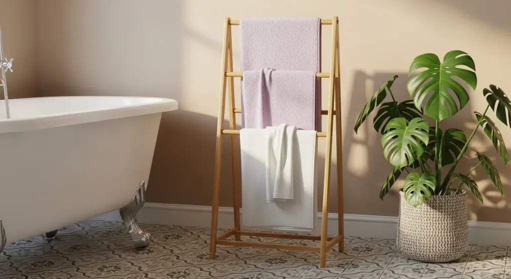 - Visual Cues: Light-toned bamboo wood, multiple horizontal bars, and draped towels in soft spring hues.