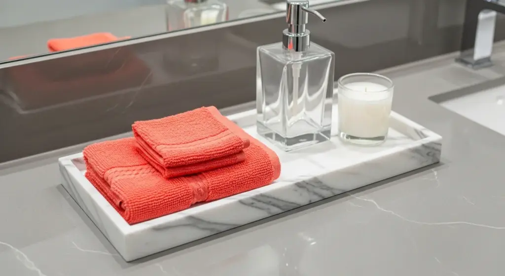 - Visual Cues: White marble with grey veining, neatly folded towels in bright spring colors like coral or yellow.
