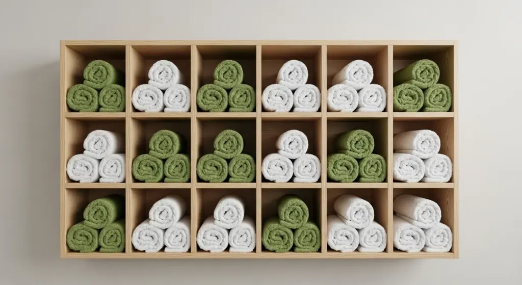 - Visual Cues: A uniform grid of square cubbies, each containing a perfectly rolled towel in alternating colors.