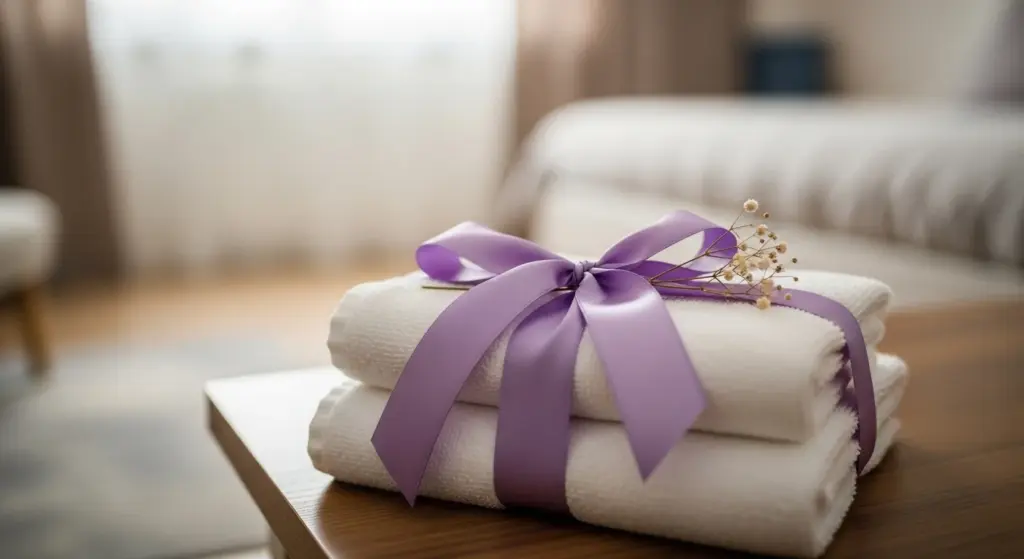 - Visual Cues: Neatly stacked towels, a delicate ribbon bow, and a small botanical tuck-in.