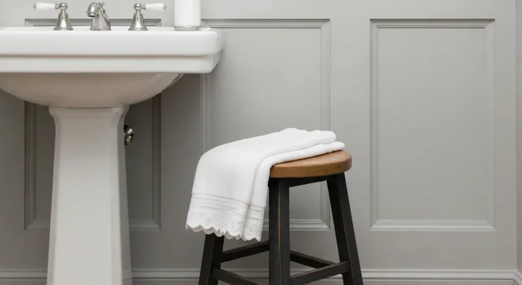 - Visual Cues: A small vintage stool next to a pedestal sink, with a decorative towel draped over the top.