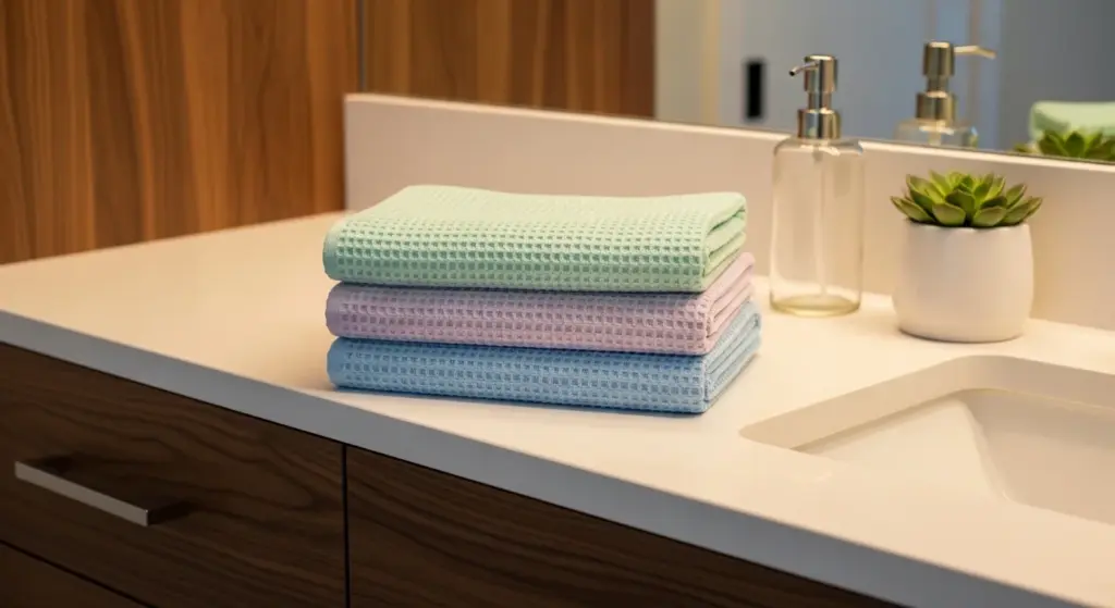 - Styling Details: Opt for towels with subtle textures, such as a waffle weave or ribbed detailing, to keep the look modern and sophisticated.