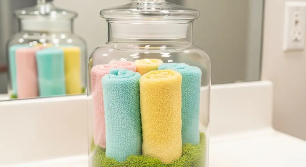 Large glass jars are a sophisticated way to store and display small washcloths or hand towels while keeping them dust-free. Rolling the towels tightly and standing them upright inside the jar allows their colors and textures to shine through the transparent glass. This creates a beautiful visual display for a vanity or deep windowsill.