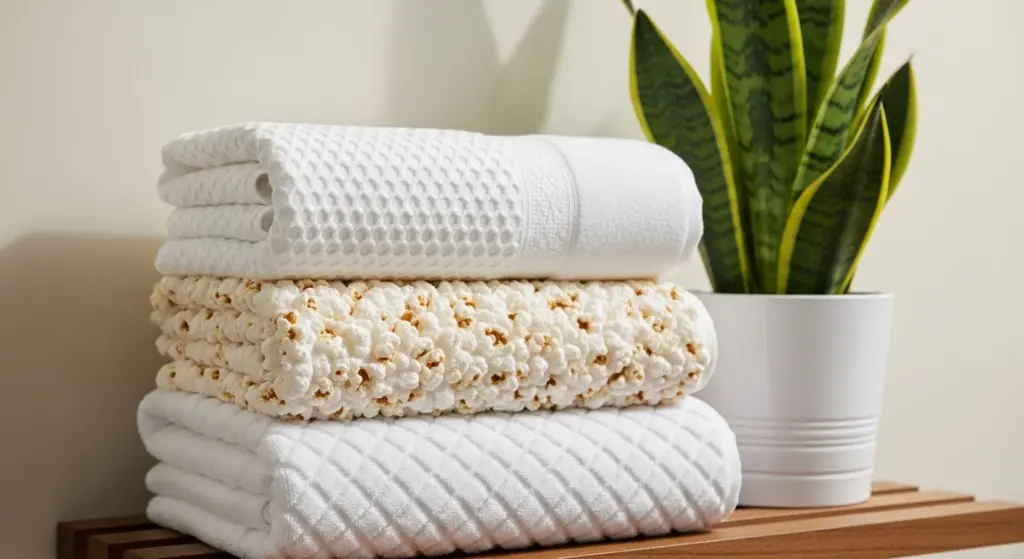 Sometimes the best way to celebrate spring is with a clean, monochromatic look using textured white towels. Instead of color, focus on interesting patterns like honeycomb, popcorn, or diamond weaves that evoke a sense of purity and cleanliness. These make any bathroom feel like a high-end hotel or a serene spa.