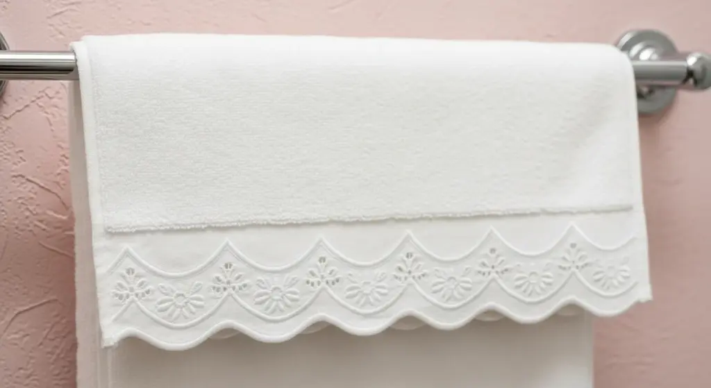 - Styling Details: Drape these over a towel bar or a pedestal sink stand so the scalloped border is clearly visible.