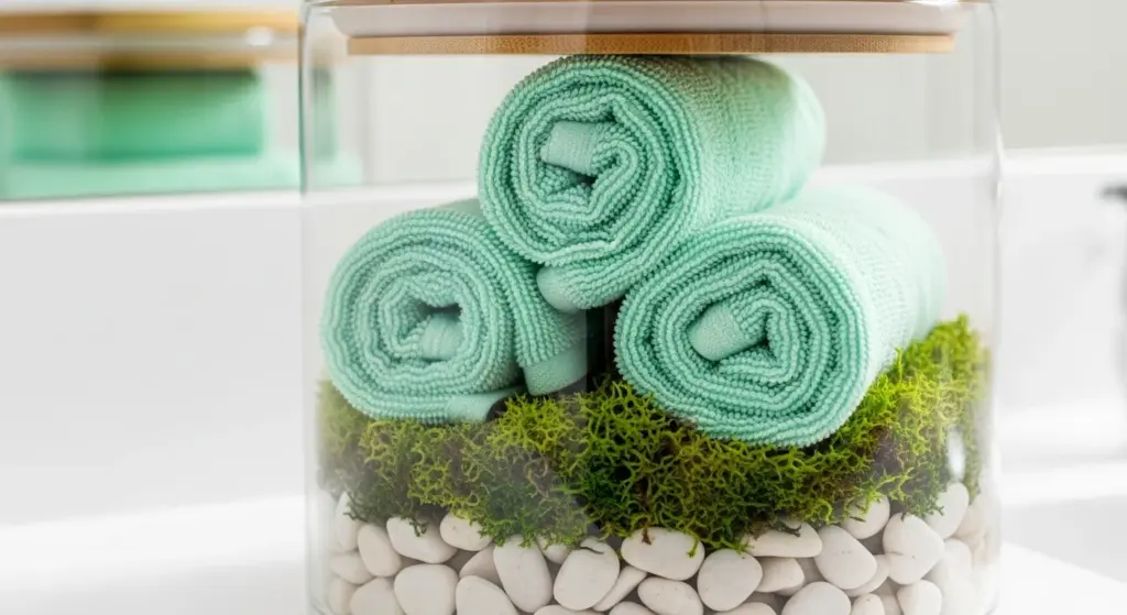 Elevate your storage by creating a terrarium-style display within a glass jar. By layering decorative stones, moss, and then your towels, you turn a storage container into a piece of seasonal art. This method is particularly effective for small washcloths used in a guest bathroom.