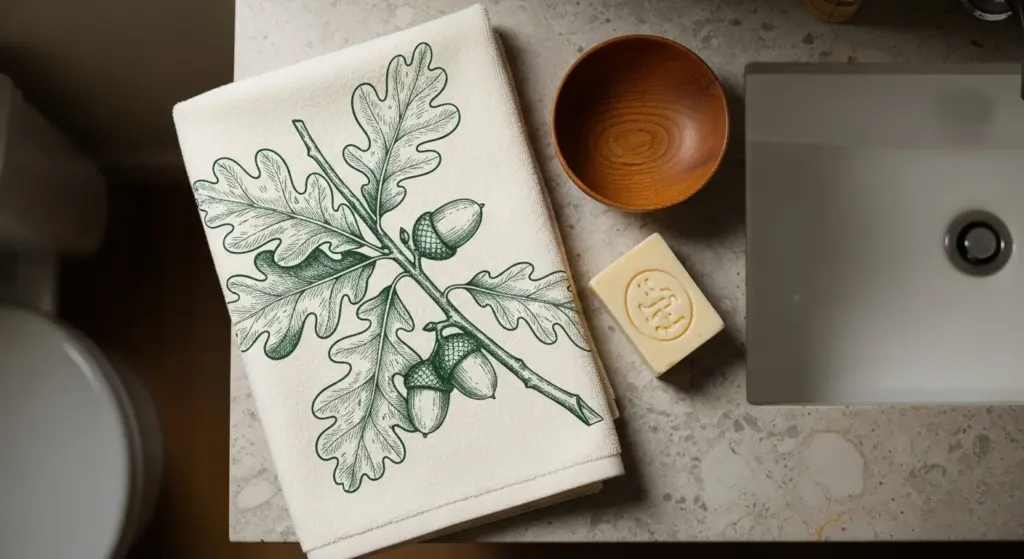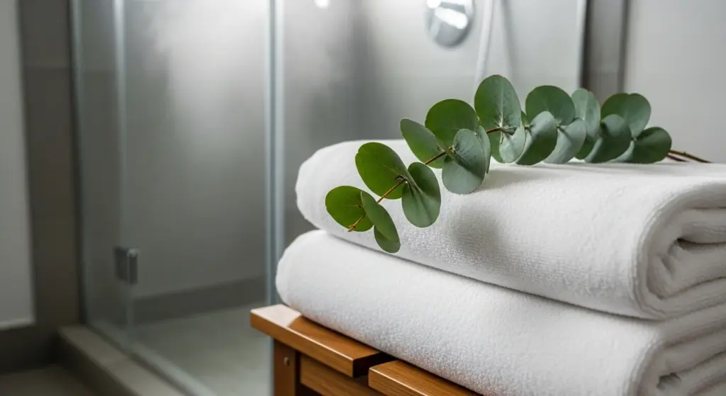 - Visual Cues: Silver-green eucalyptus leaves paired with crisp white or soft gray towels.