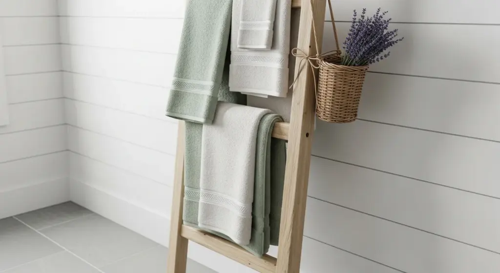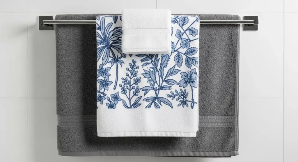 Layering towels of different sizes and textures is a professional styling trick that adds depth to your display. Start with a large, solid-colored bath towel as the base and layer a smaller, patterned hand towel directly over the center. This intentional approach makes the towel rack look high-end and curated.