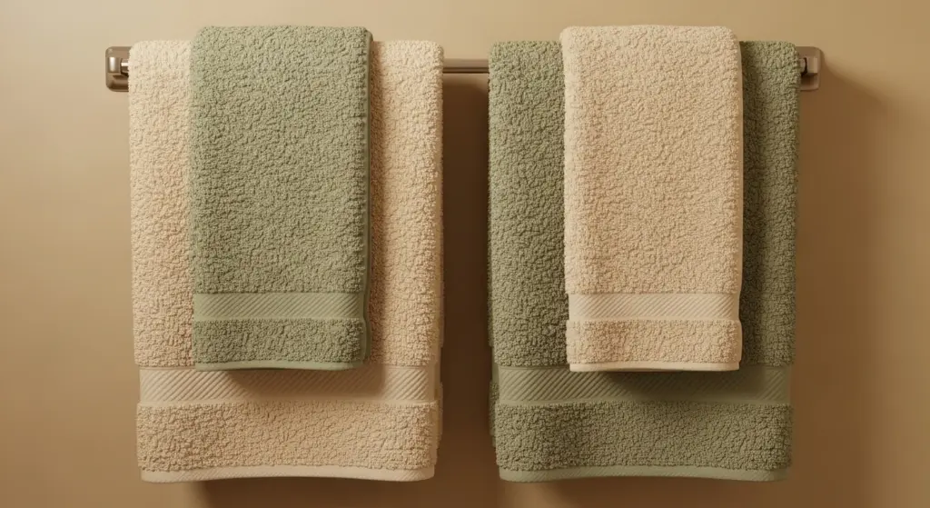 Combining sage green and cream towels creates a layered effect that feels organic and calming. This specific color pairing mimics the look of new spring leaves against a neutral sky, making the bathroom feel peaceful and grounded. It is a sophisticated way to introduce color without overwhelming the space.