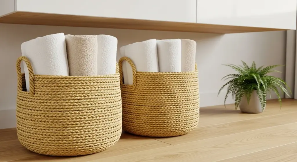- Styling Details: Use different basket sizes to separate bath towels, hand towels, and washcloths for a curated look.
