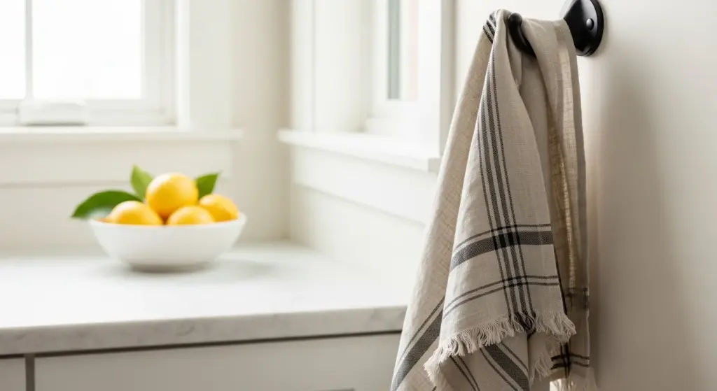 Transitioning to lightweight linen towels is a practical and stylish way to welcome the warmer months. Linen is highly absorbent and dries quickly, featuring a slightly wrinkled texture that adds a relaxed, effortless charm to the space. These look particularly beautiful when hung from simple wall hooks or oven handles in a kitchen-adjacent bathroom.