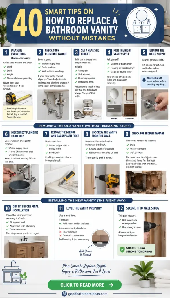 Here’s the deal: replacing a bathroom vanity isn’t rocket science, but it can go sideways fast if you skip the basics. Ever tried installing a vanity only to realize it doesn’t fit through the door? Yeah… not fun.