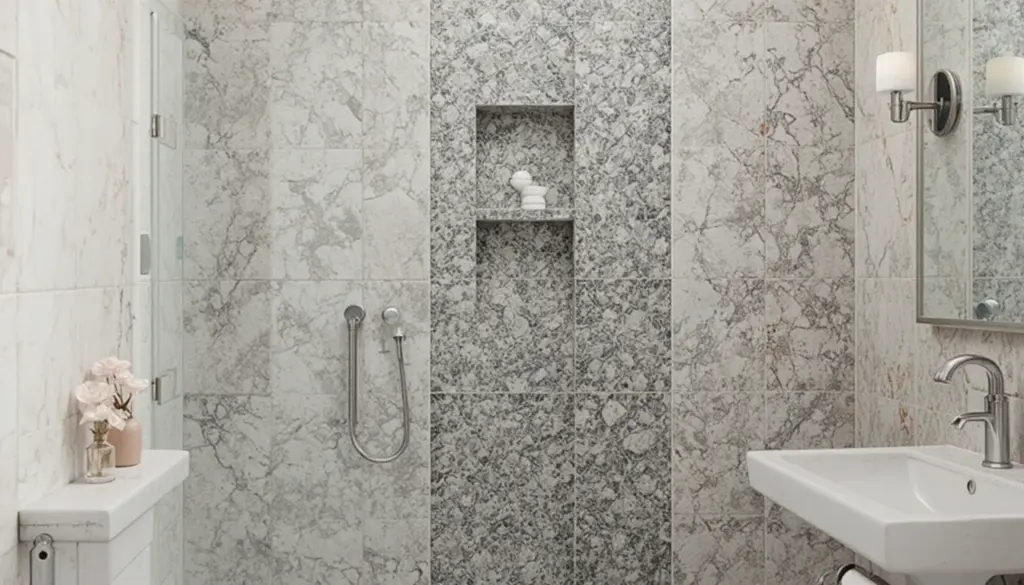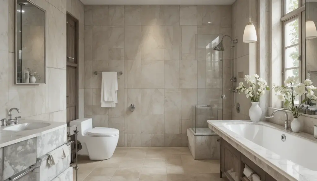 Large tiles actually make the room feel less cluttered because they reduce grout lines.