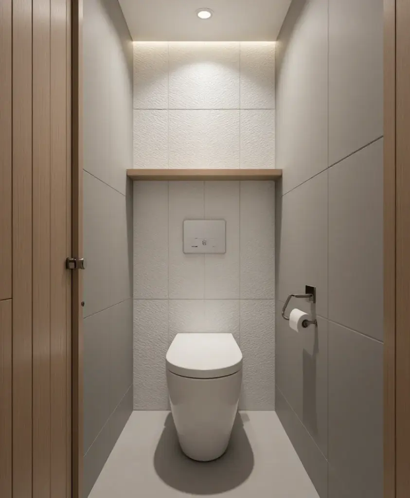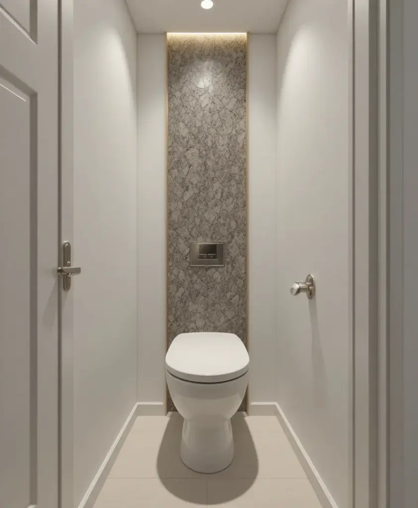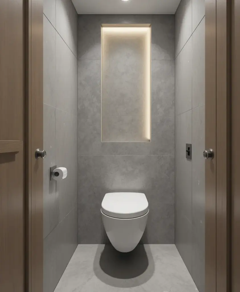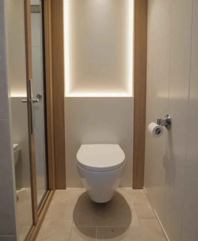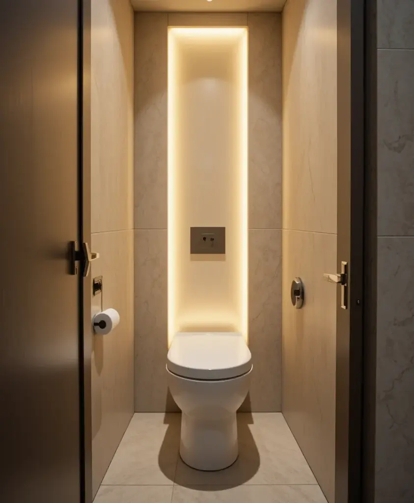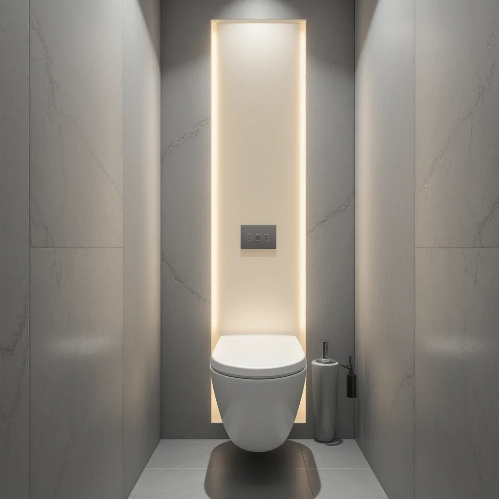 A vertical recessed lighting panel behind a slim toilet adds depth while visually increasing height. The soft glow creates a modern and luxurious feel without taking up space. Keeping surrounding finishes neutral ensures balance. This design works well in ultra-compact bathrooms.