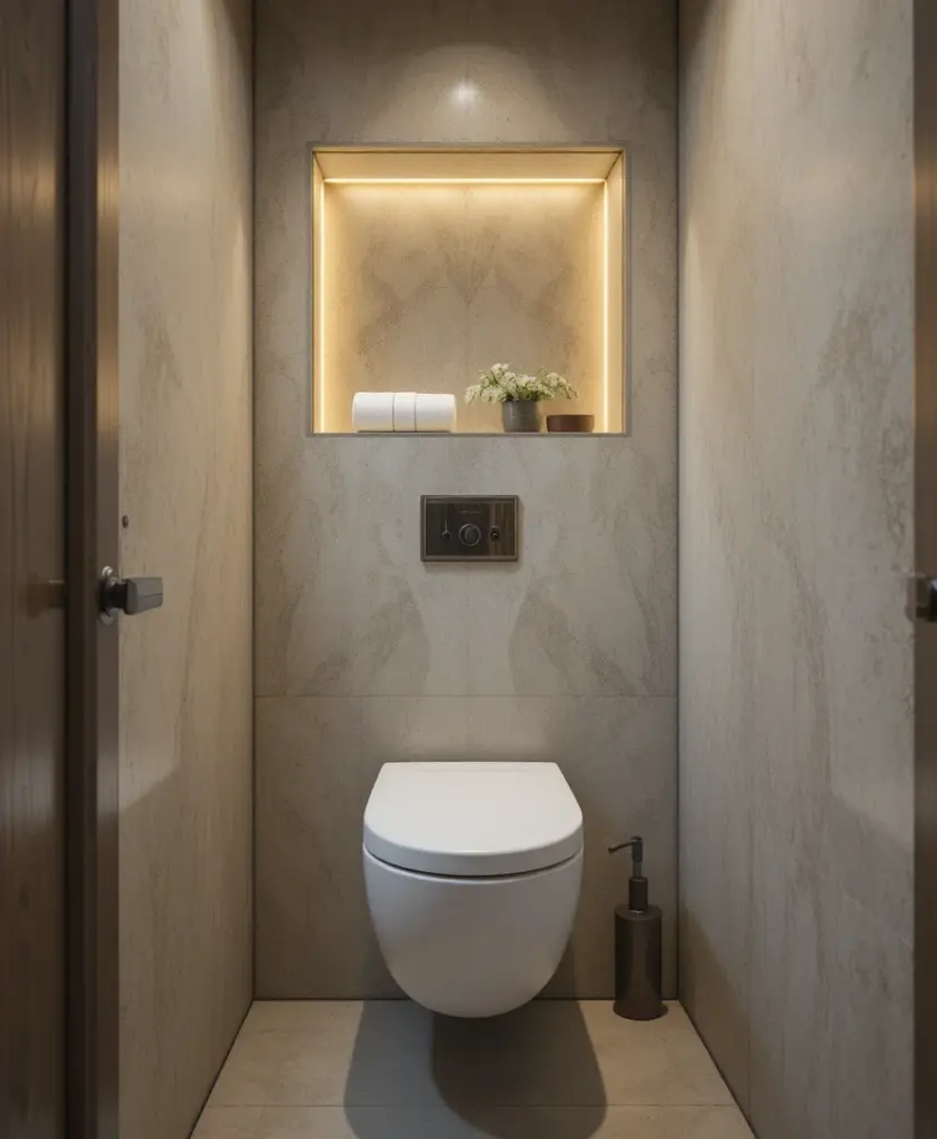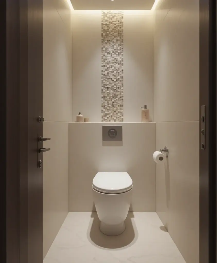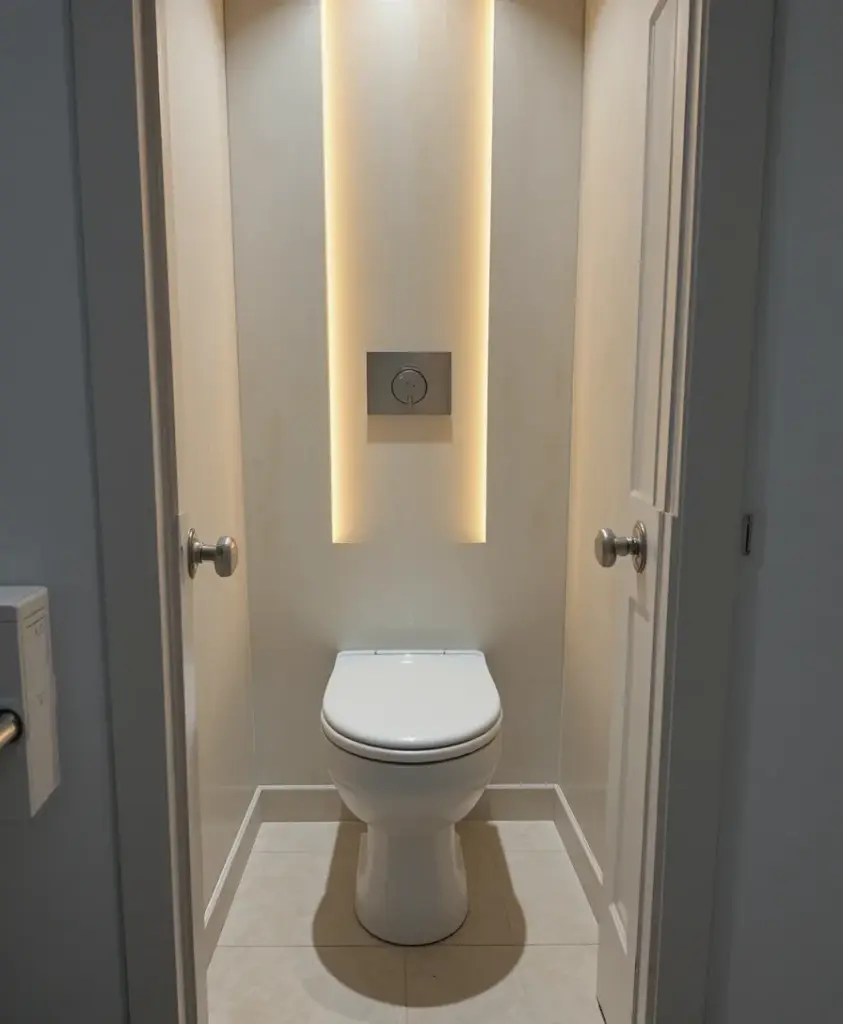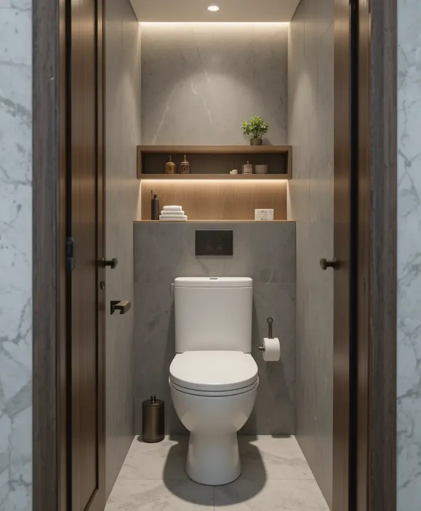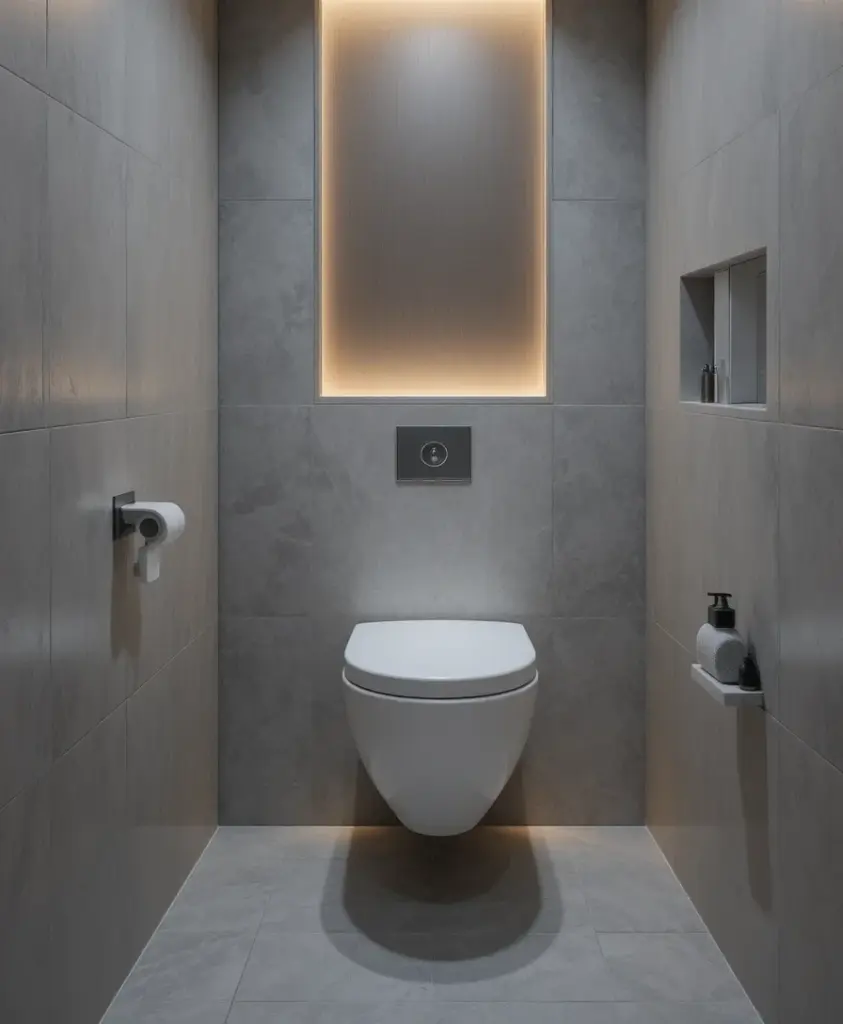 A vertical recessed lighting panel behind a slim toilet adds depth while visually increasing height. The soft glow creates a modern and luxurious feel without taking up space. Keeping surrounding finishes neutral ensures balance. This design works well in ultra-compact bathrooms.