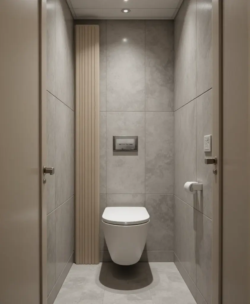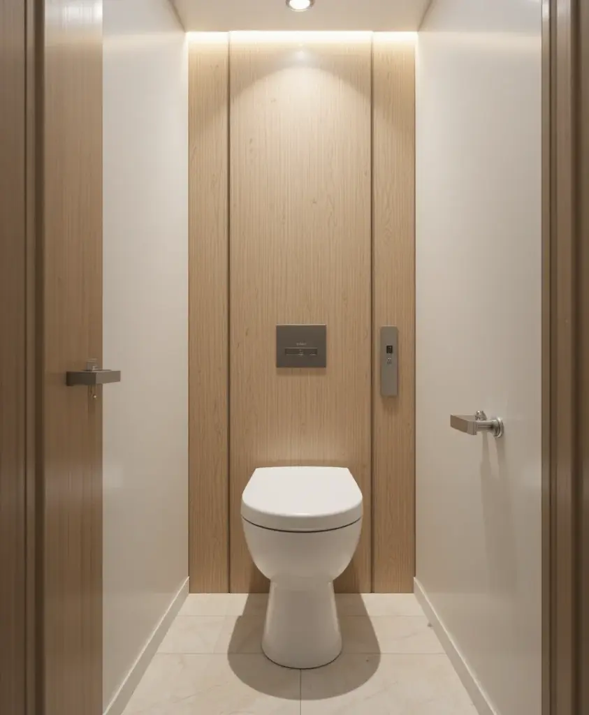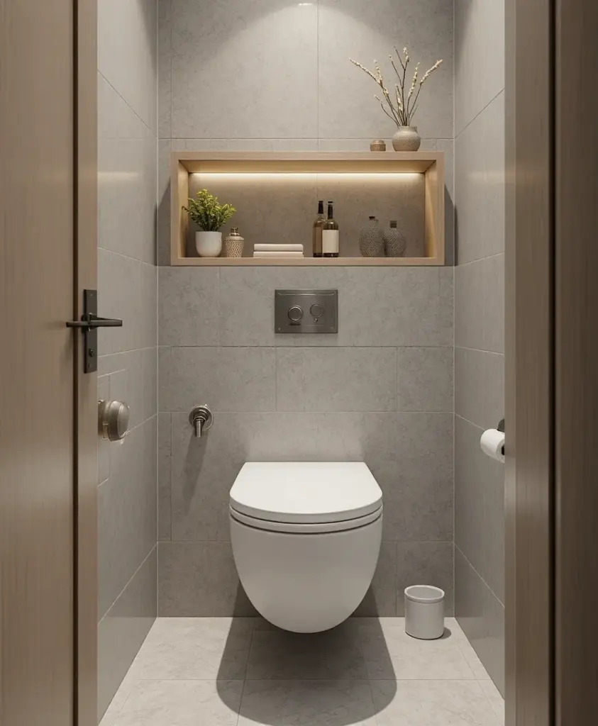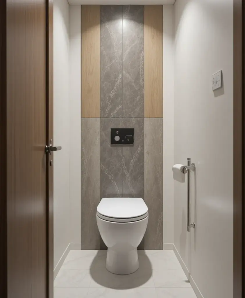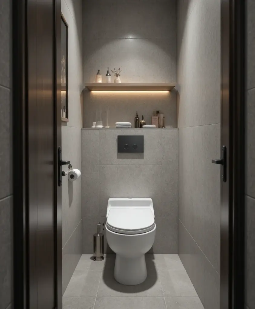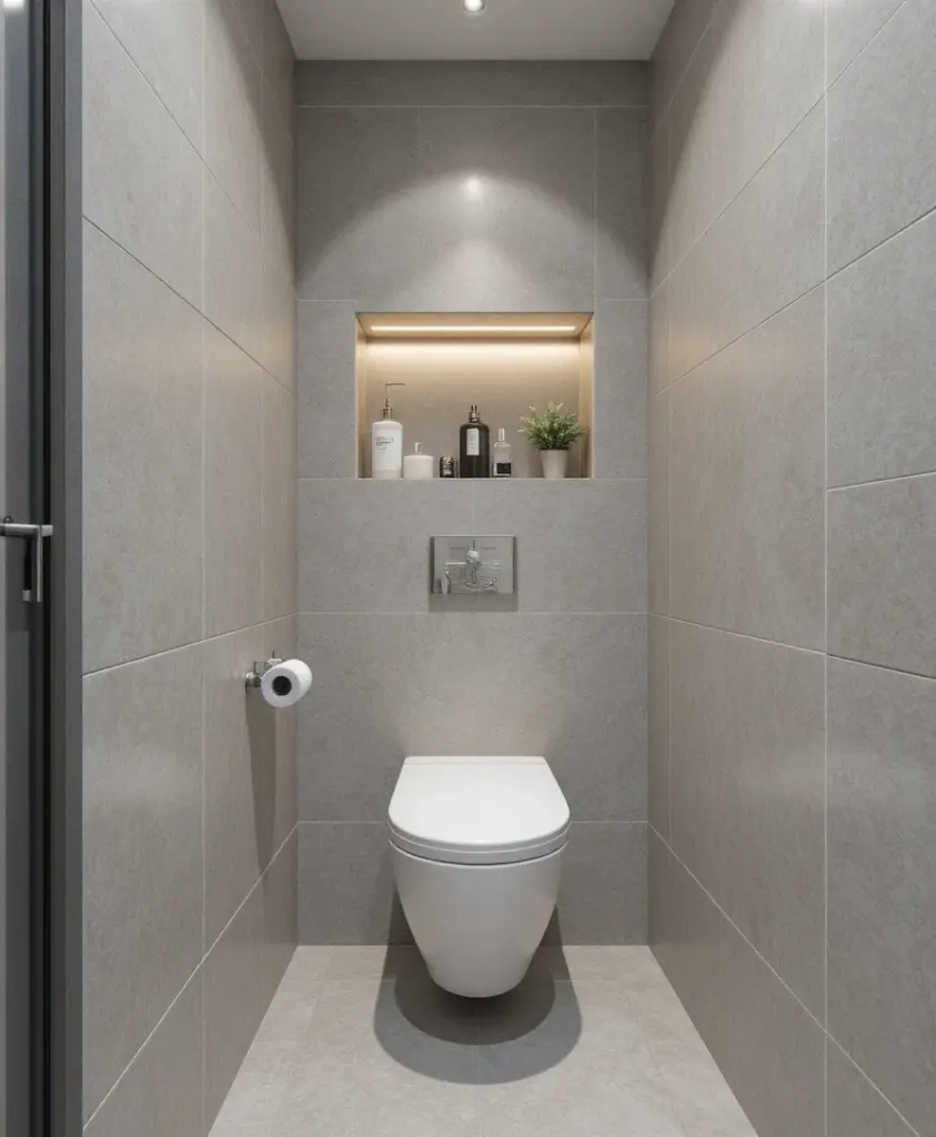 A vertical recessed lighting panel behind a slim toilet adds depth while visually increasing height. The soft glow creates a modern and luxurious feel without taking up space. Keeping surrounding finishes neutral ensures balance. This design works well in ultra-compact bathrooms.