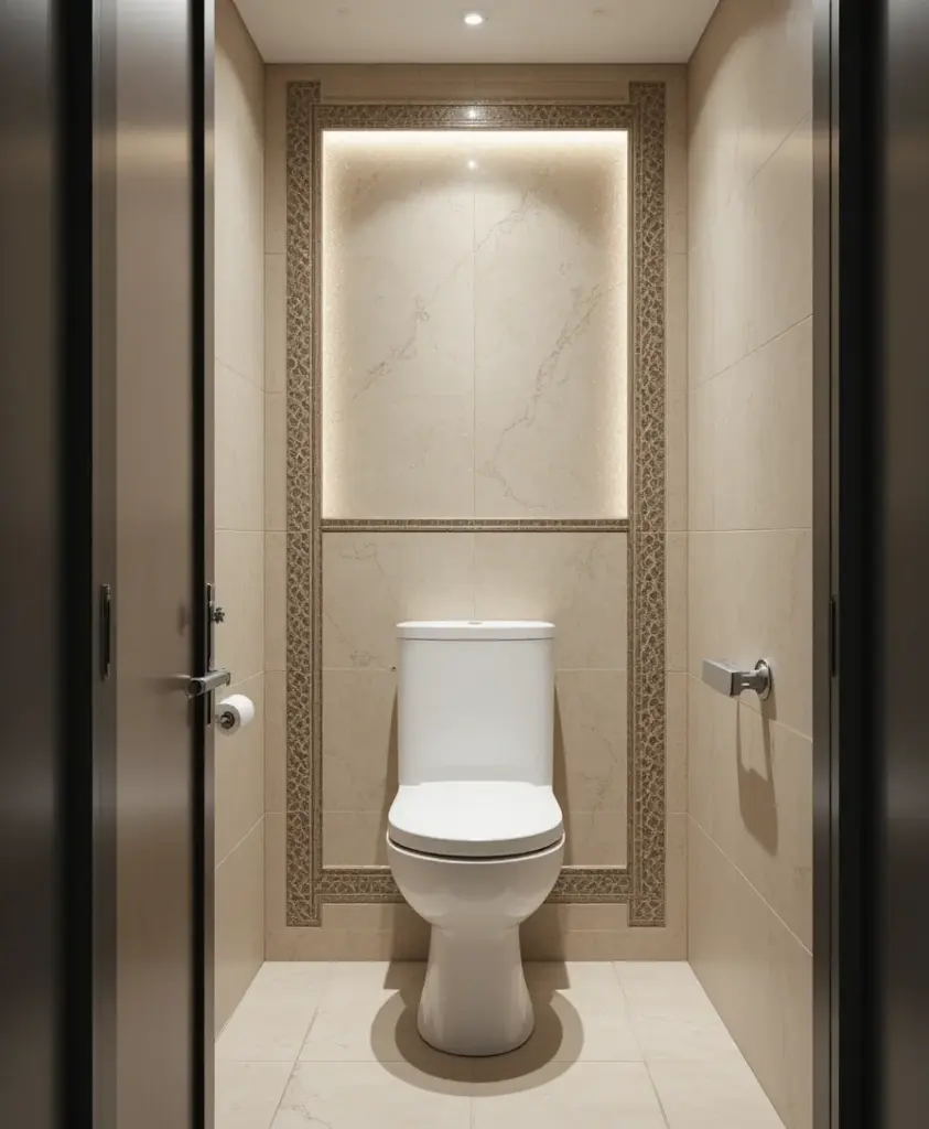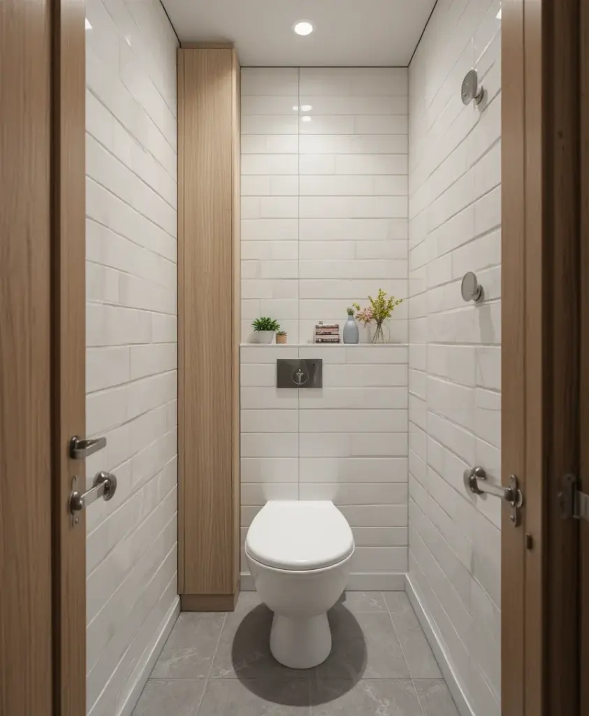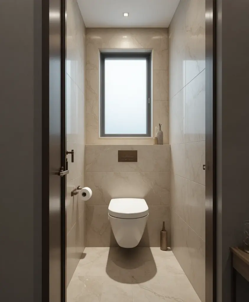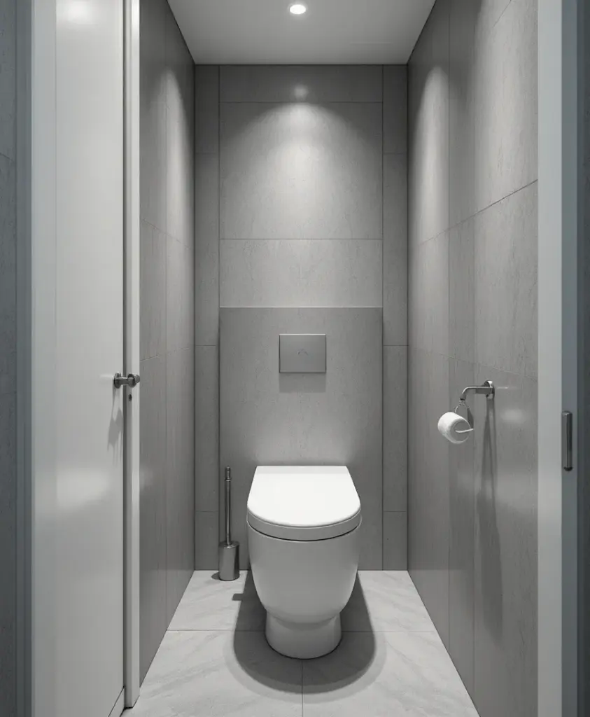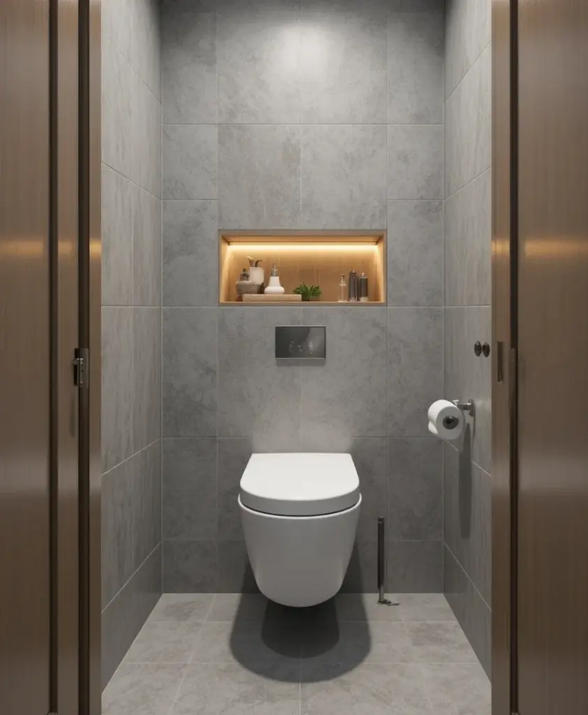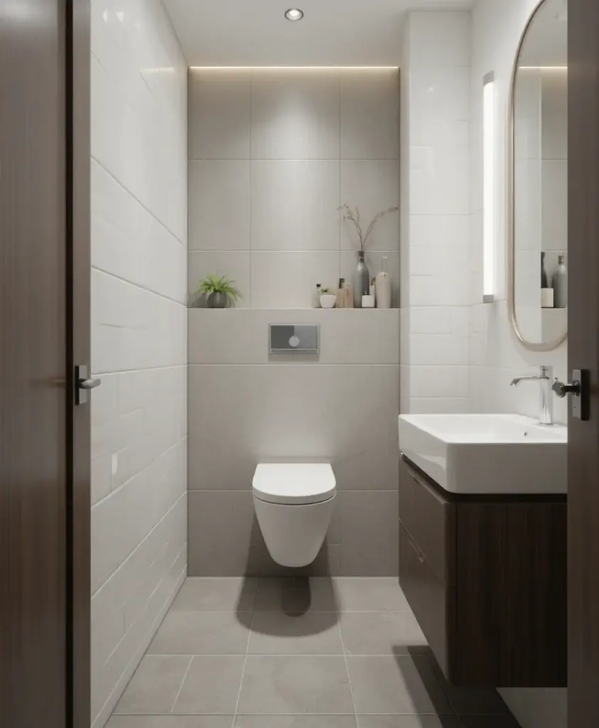 A vertical recessed lighting panel behind a slim toilet adds depth while visually increasing height. The soft glow creates a modern and luxurious feel without taking up space. Keeping surrounding finishes neutral ensures balance. This design works well in ultra-compact bathrooms.