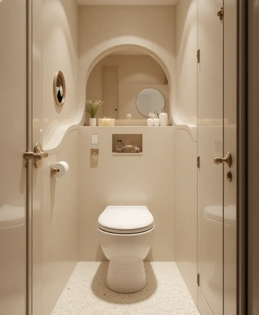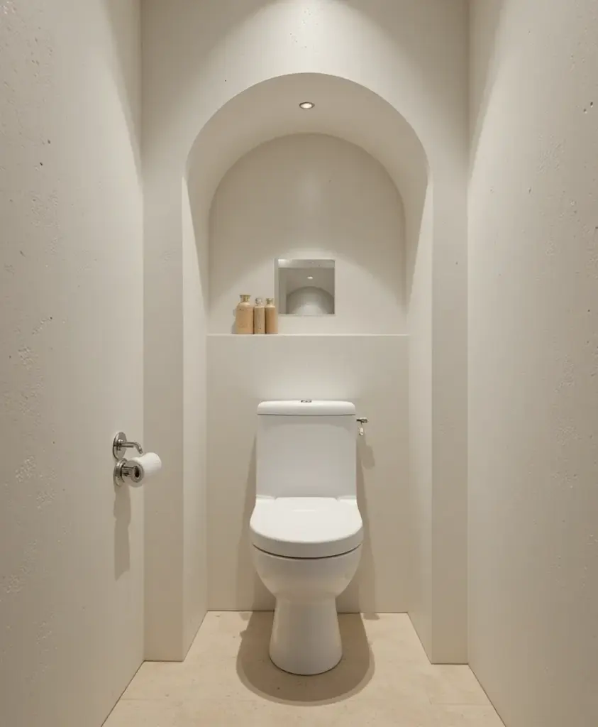 An arched wall detail behind a compact toilet softens the overall layout and adds architectural interest. Light tones keep the space airy while the curve adds visual flow. This works beautifully in modern or Mediterranean-inspired small bathrooms. Keep accessories minimal.