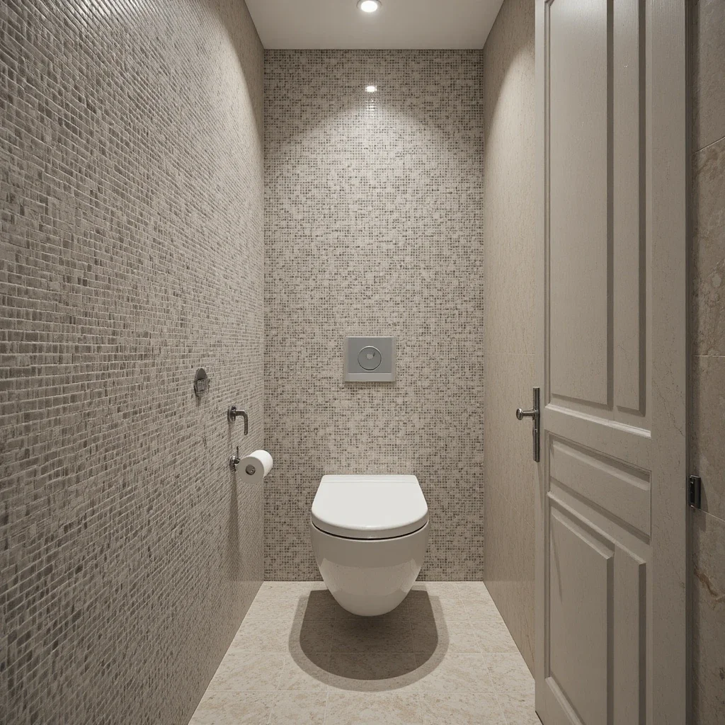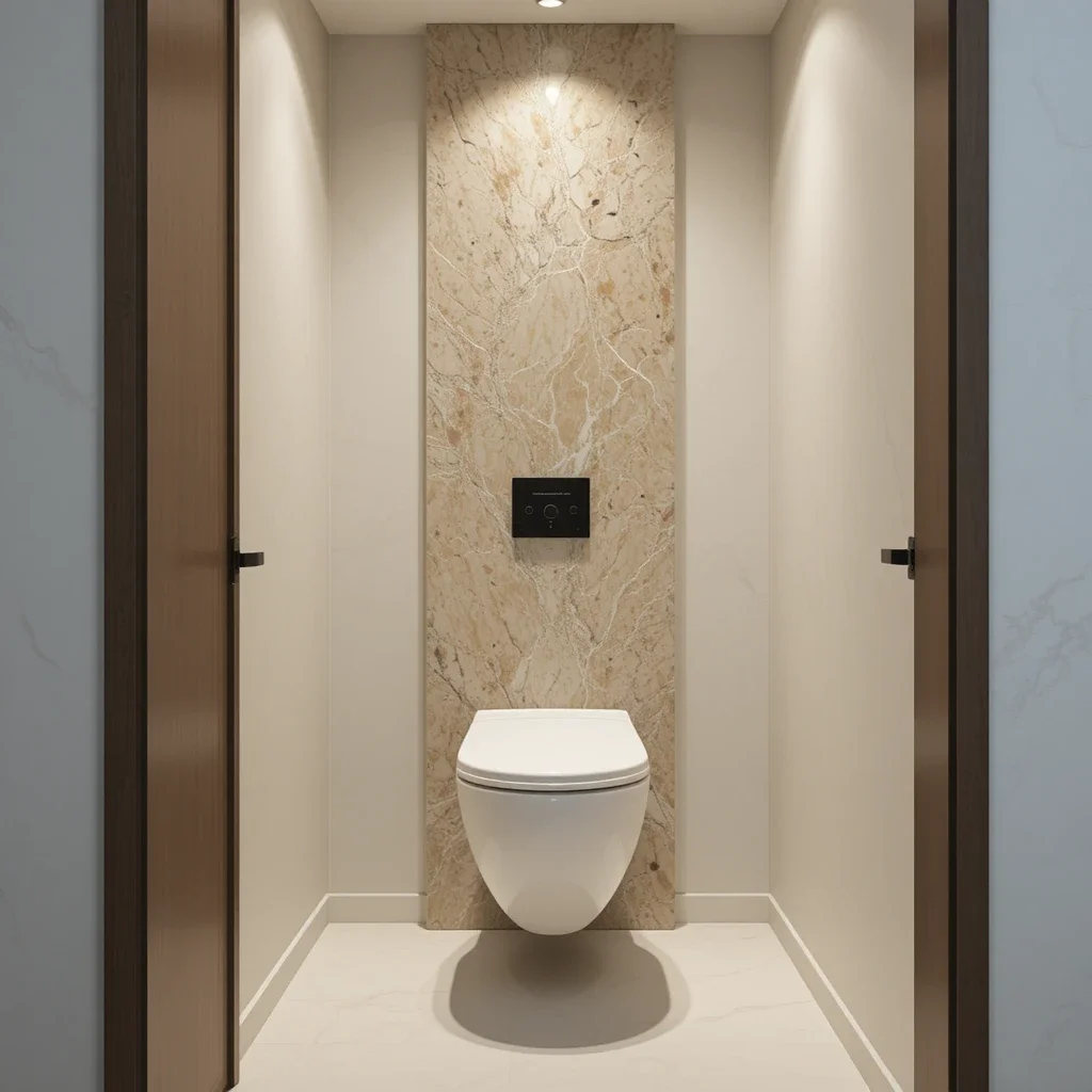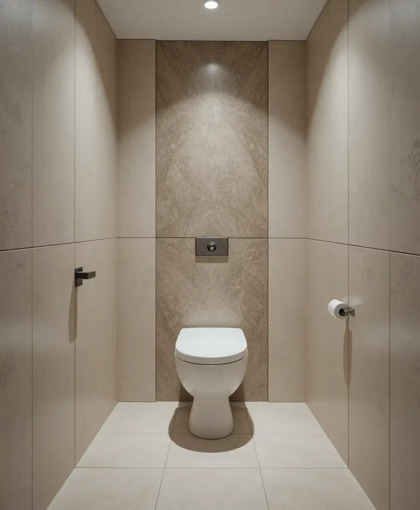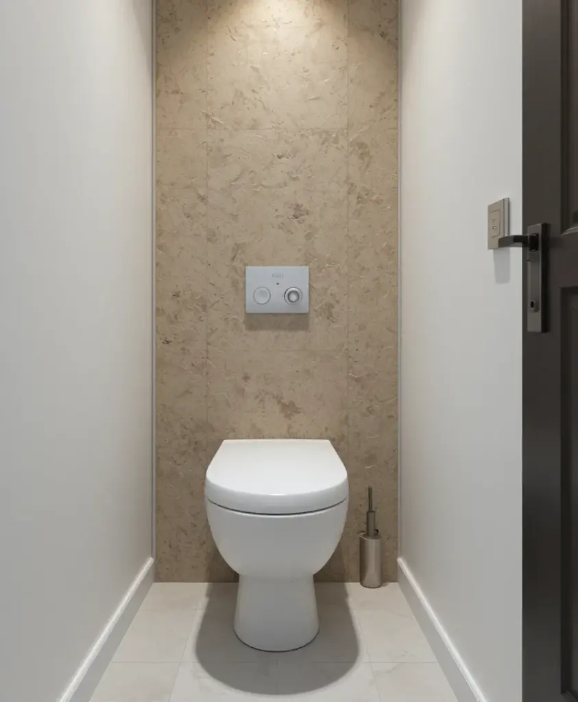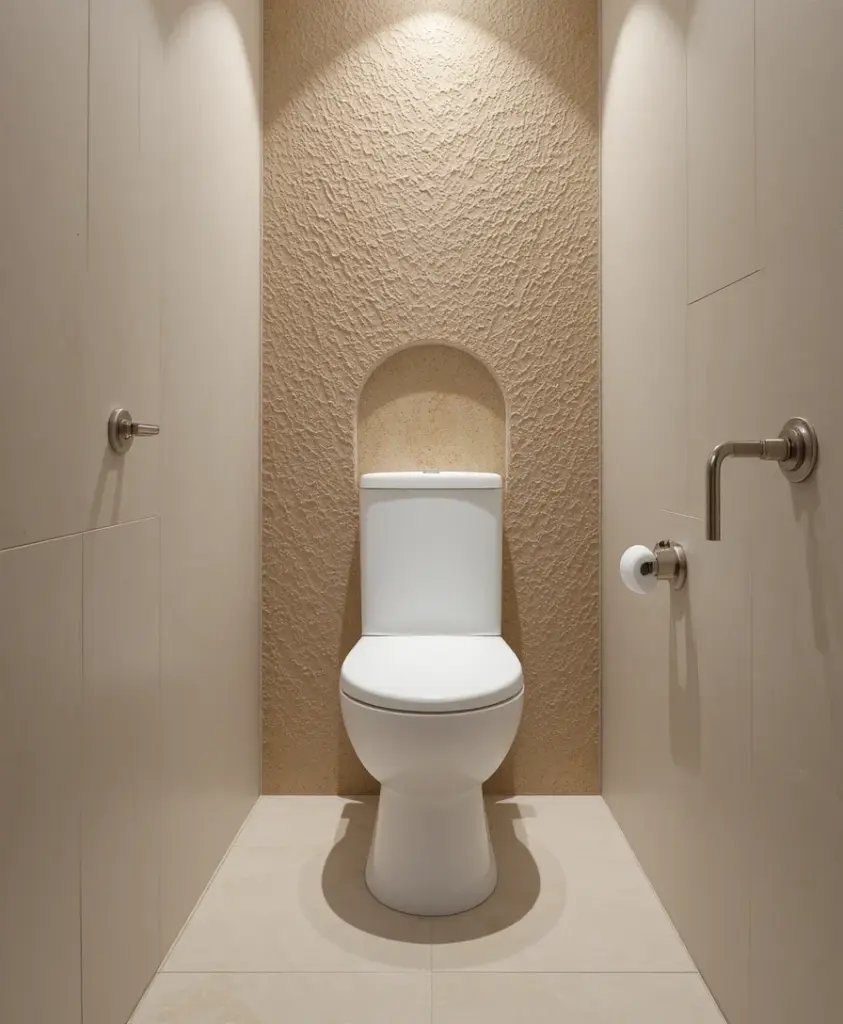 A light textured wall behind an ultra-compact toilet introduces depth while maintaining brightness. Soft plaster or micro-texture works well. Minimal décor keeps the layout uncluttered. This design is ideal for very small spaces.