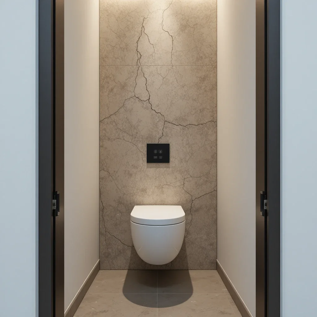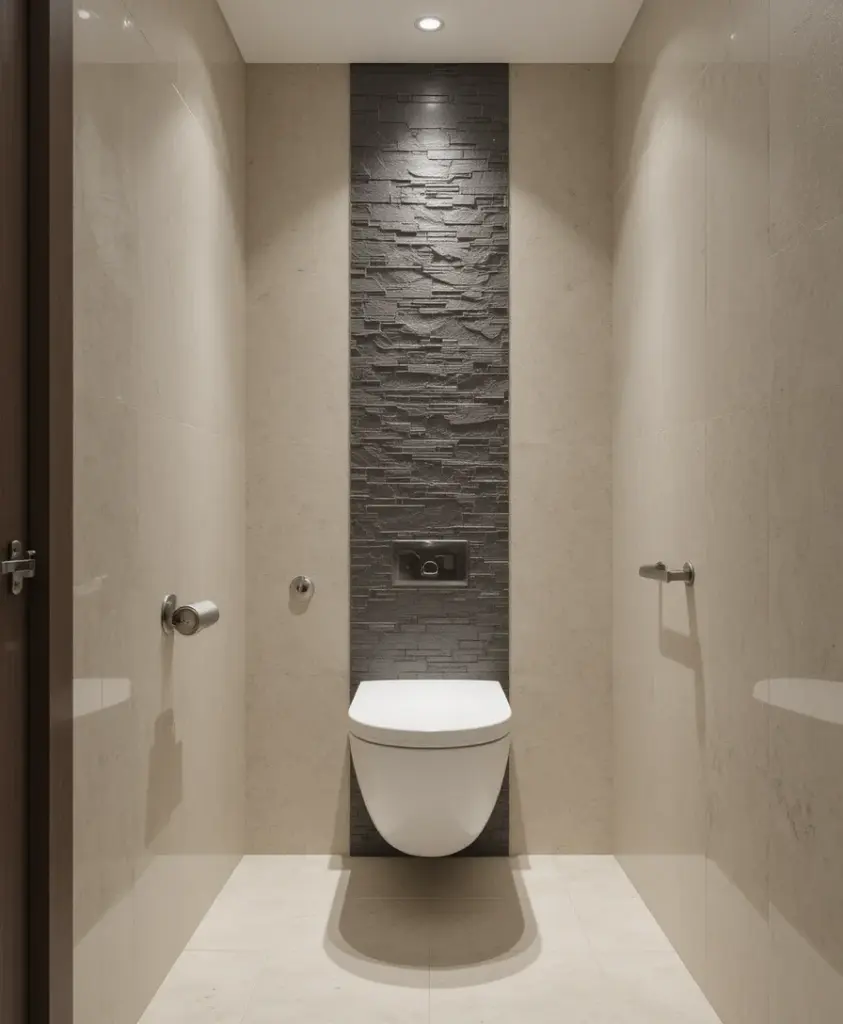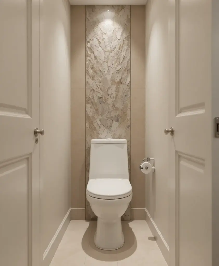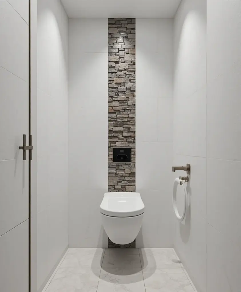 A vertical stone texture panel behind a compact toilet introduces natural depth while enhancing height. The subtle texture adds interest without overwhelming the small layout. Light stone tones help maintain an airy feel. This design suits modern minimalist bathrooms.