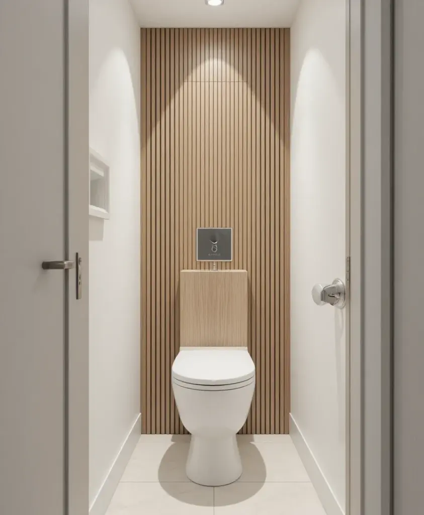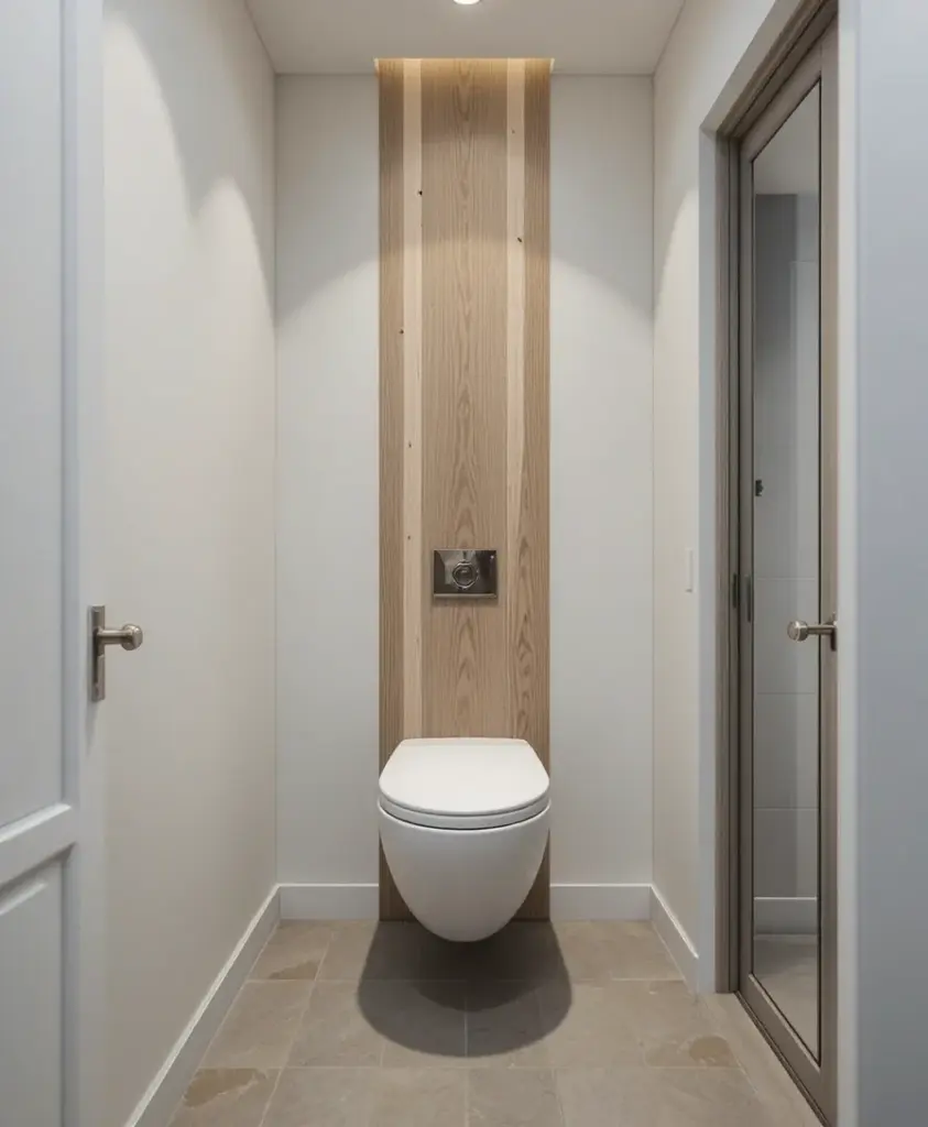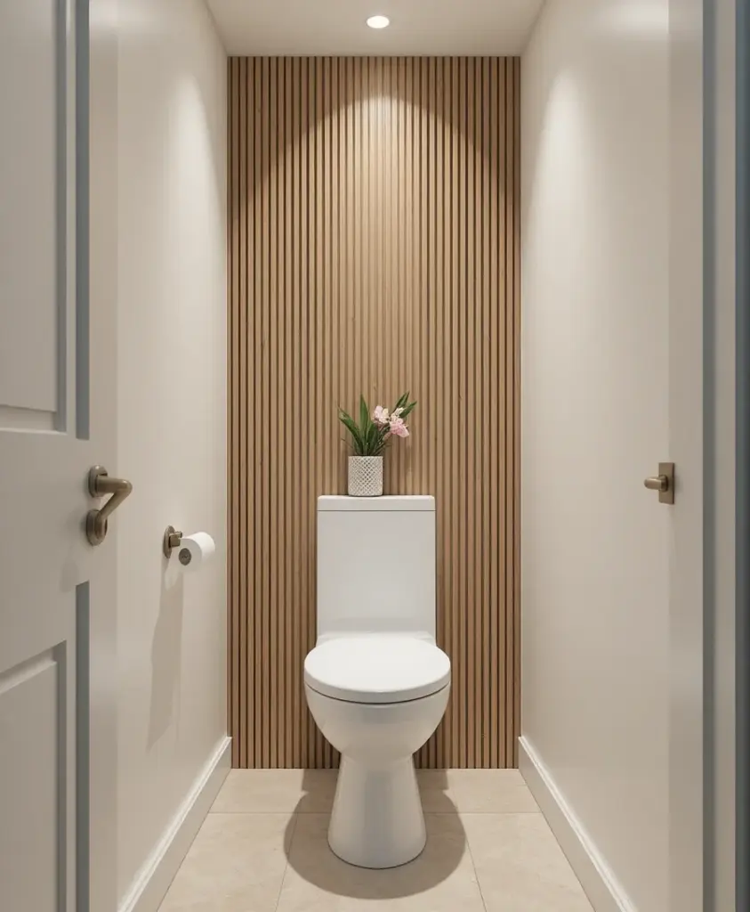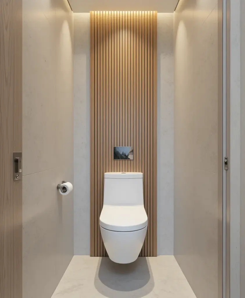 A light wood accent wall behind a compact toilet introduces warmth without making the space feel heavy. Vertical wood panels help draw the eye upward, enhancing height perception. Pair with neutral tiles and minimal accessories to keep the layout balanced. This design works beautifully in modern small bathrooms.