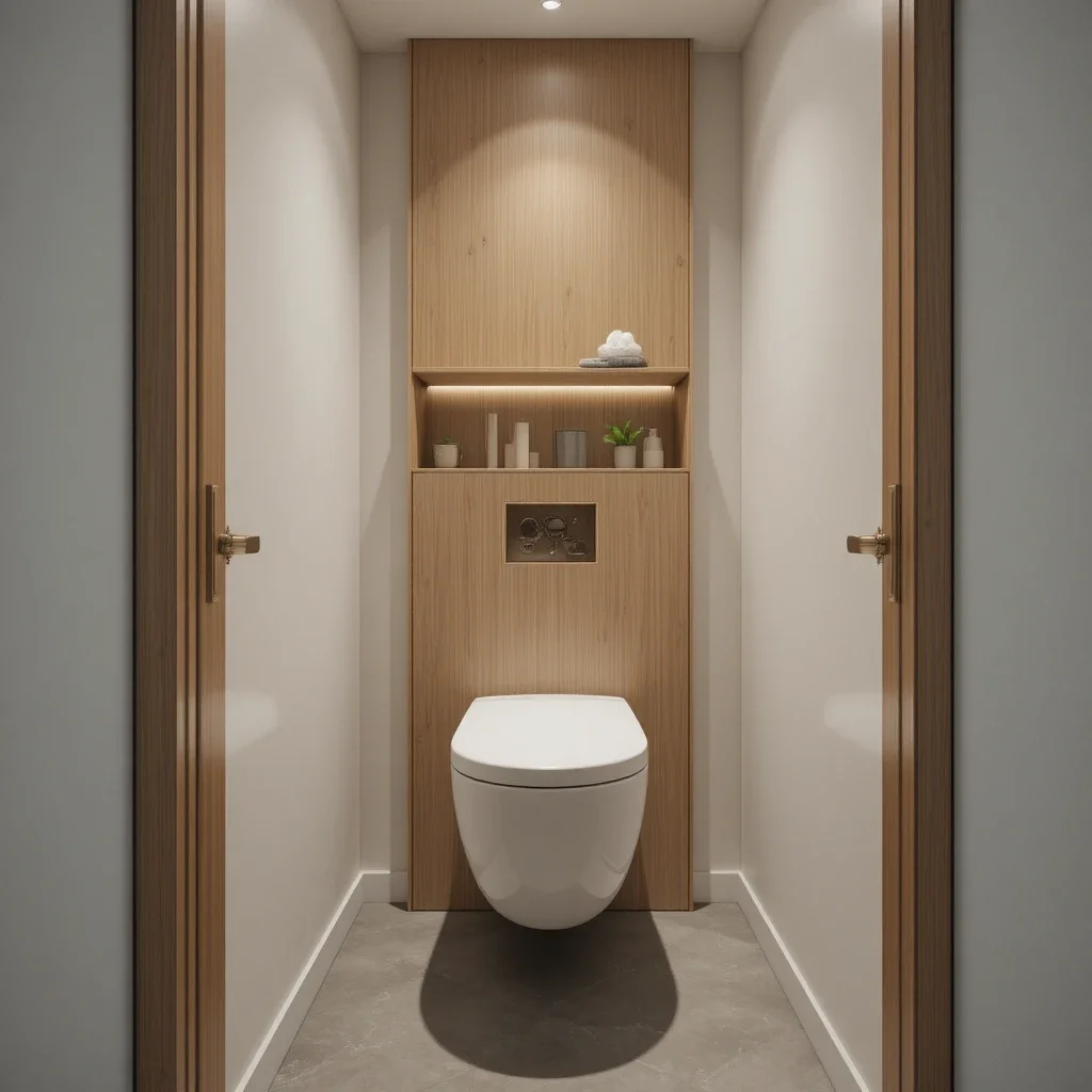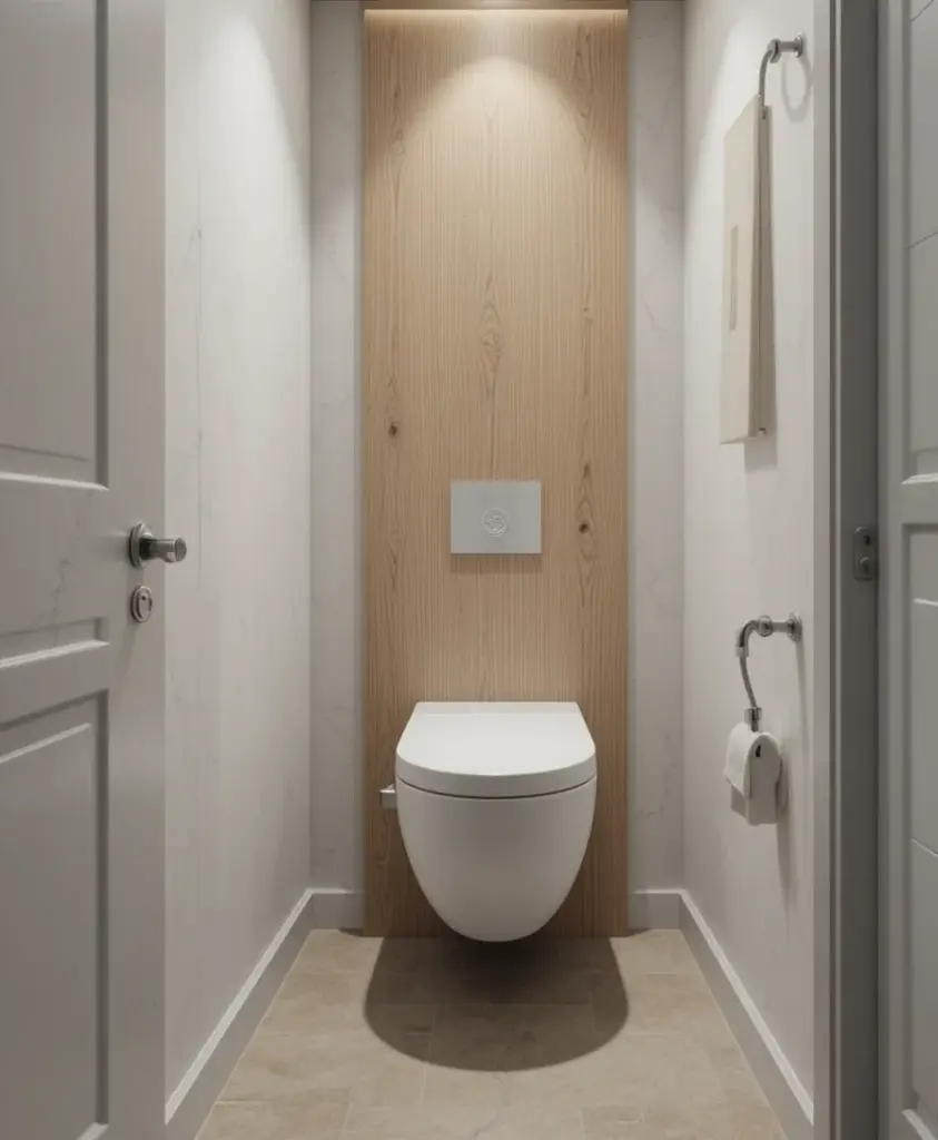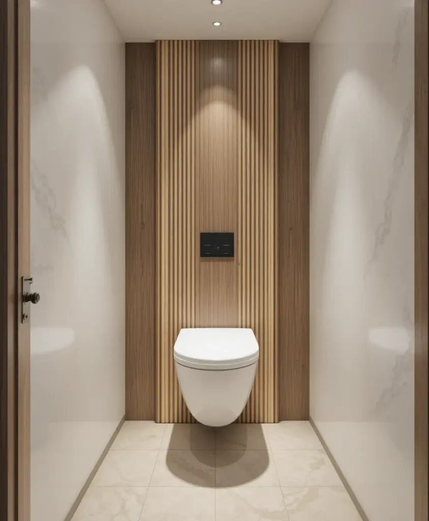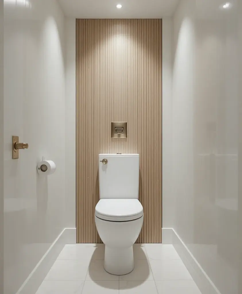 A light wood accent wall behind a compact toilet introduces warmth without making the space feel heavy. Vertical wood panels help draw the eye upward, enhancing height perception. Pair with neutral tiles and minimal accessories to keep the layout balanced. This design works beautifully in modern small bathrooms.