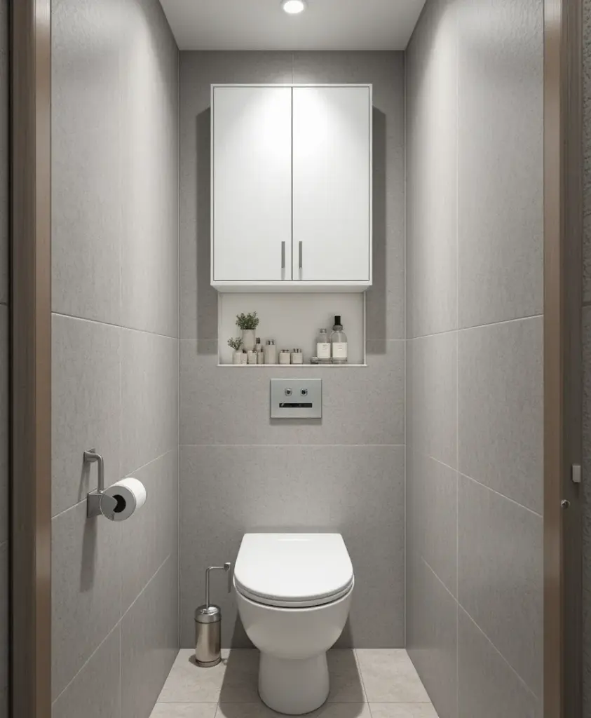 Utilizing vertical space above the toilet with a built-in cabinet increases storage without crowding the floor. A shallow cabinet keeps proportions balanced. Matching the cabinet color with wall tones helps maintain a seamless appearance. Minimal hardware keeps it clean.