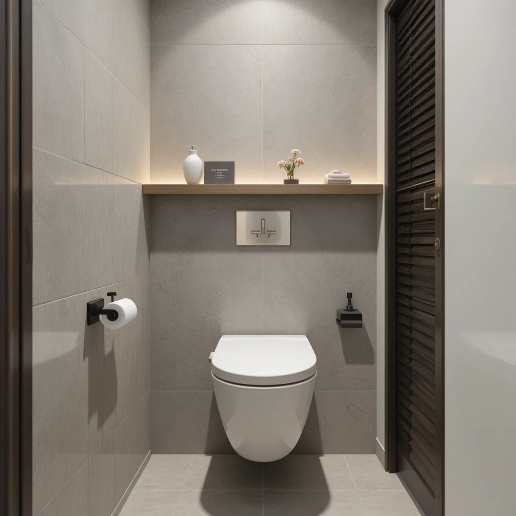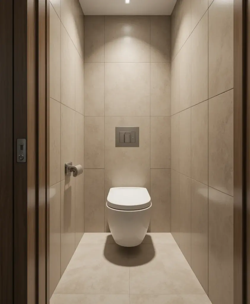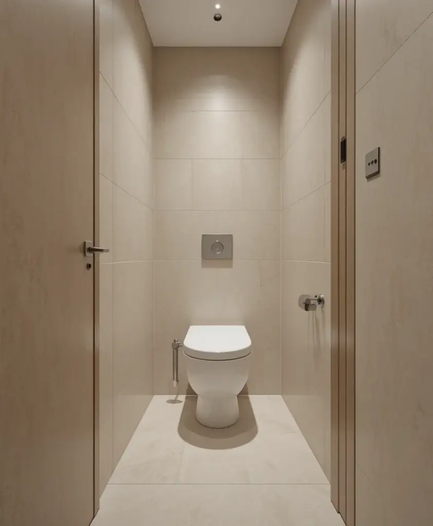 An ultra-slim toilet paired with seamless neutral walls creates a clean and spacious look. Minimal visual breaks help the room feel larger. Soft beige or warm gray tones maintain brightness. This design is ideal for very compact layouts.