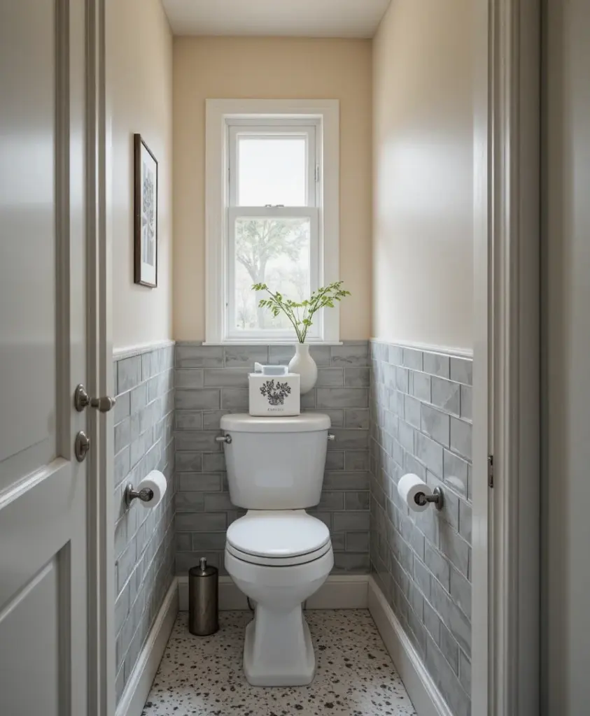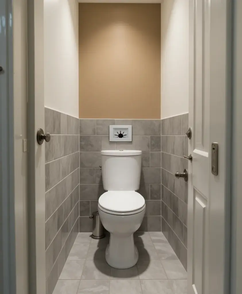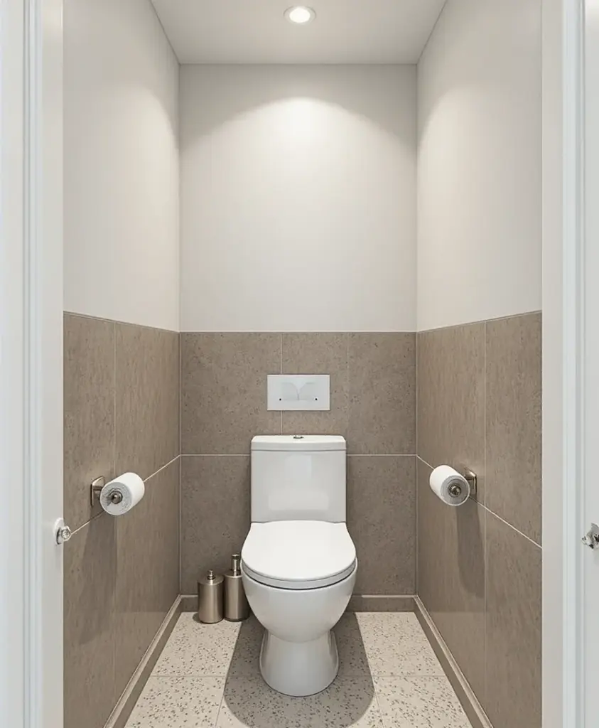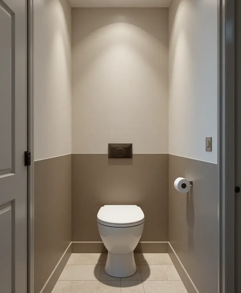 Two-tone walls create visual interest without overwhelming a small space. Pairing a compact toilet with darker lower walls and lighter upper walls adds balance. This approach defines the area while keeping it open. Neutral tones work best.