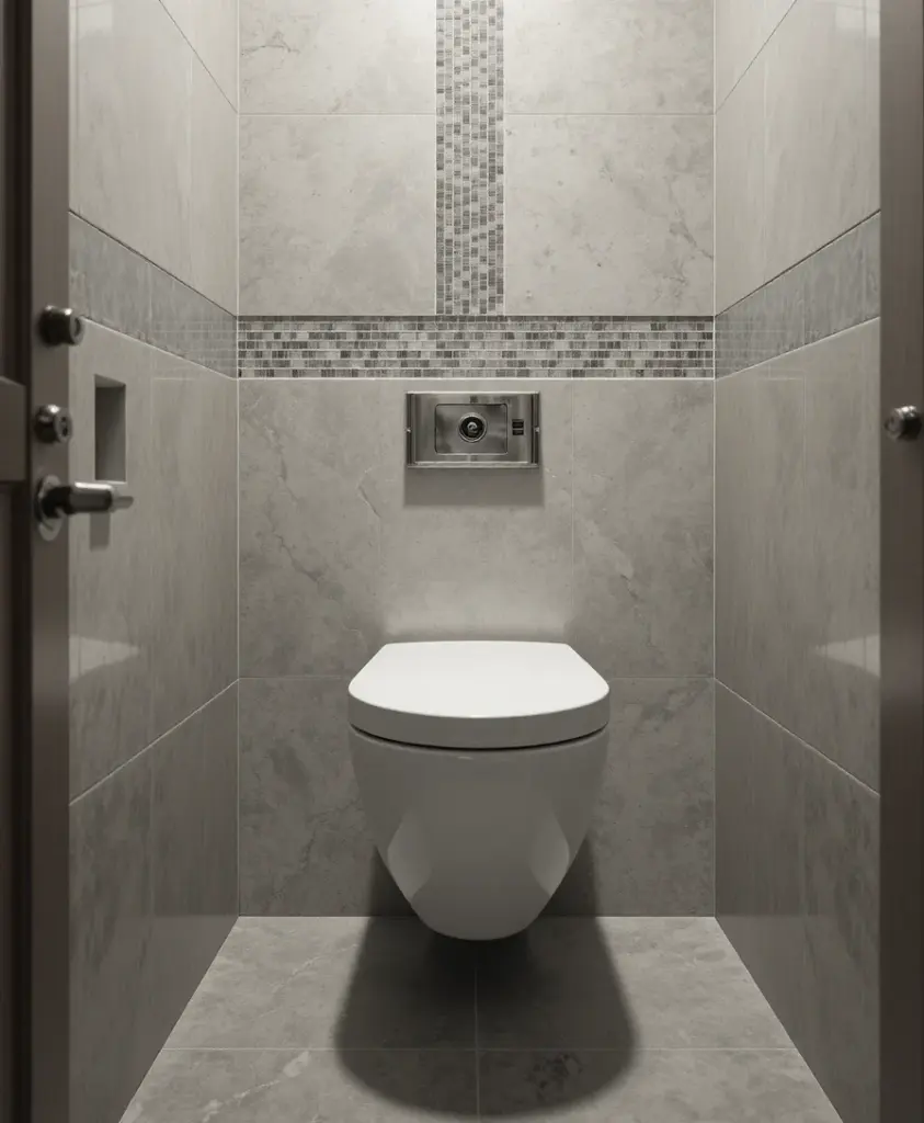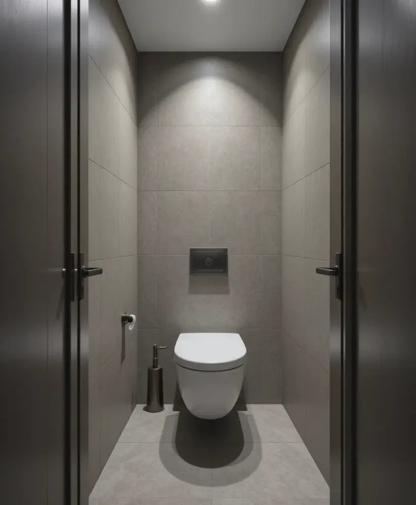 An ultra-slim toilet paired with seamless light tiles creates a bright and spacious effect. Minimal grout lines reduce visual clutter. Light tones reflect more light. This design is perfect for very tight bathrooms.