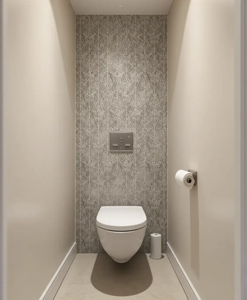 A textured neutral backdrop adds subtle interest without overwhelming a small space. Pairing with a compact toilet keeps the layout efficient. Soft tones maintain brightness. This design works in modern minimalist homes.