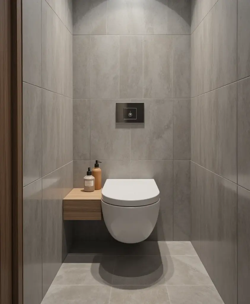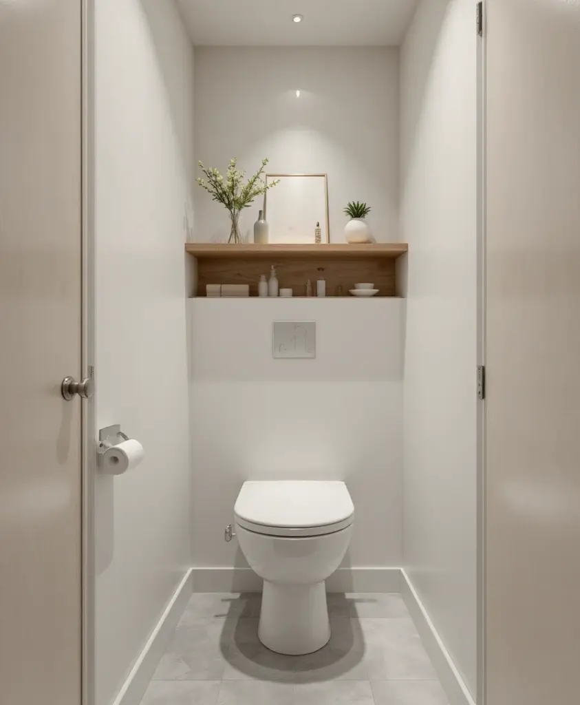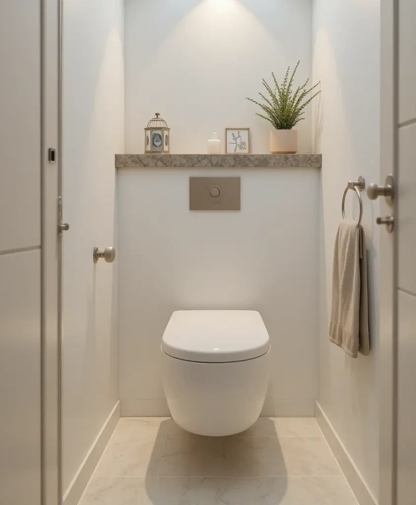 A hidden cistern wall creates a clean, built-in appearance that makes small bathrooms feel organized. The ledge formed above the concealed tank can double as a display shelf. Light tiles keep the space open while the floating toilet enhances floor visibility. This layout is both practical and modern.