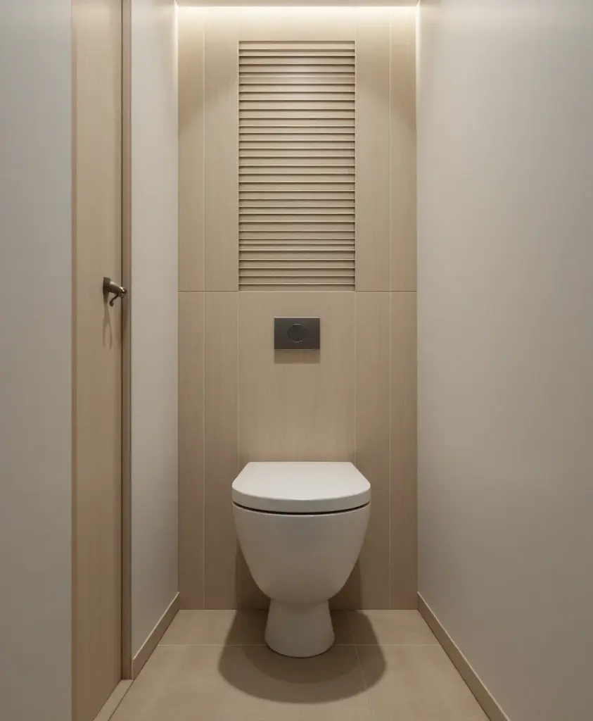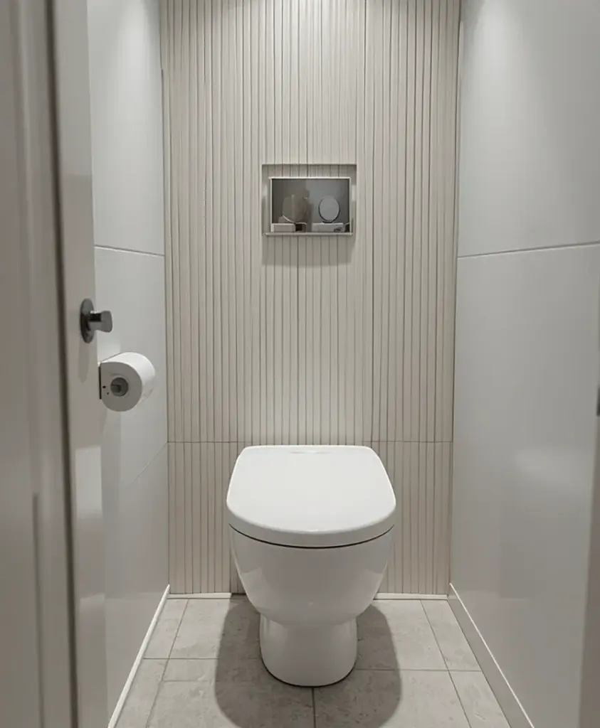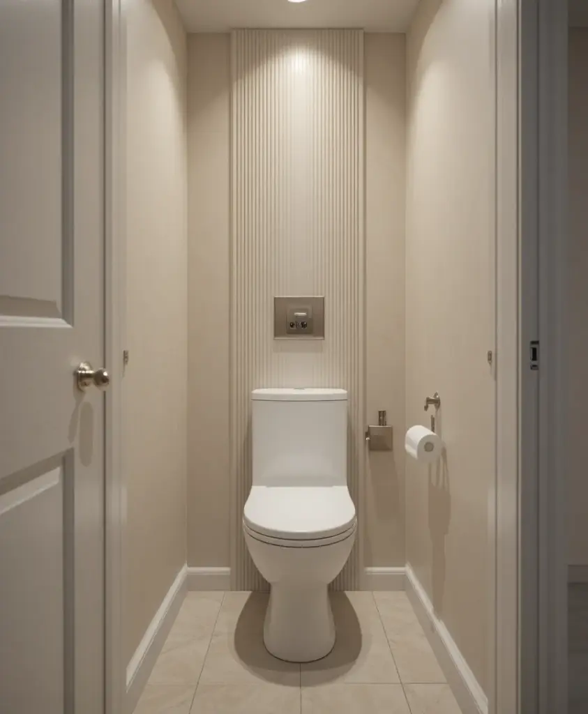 A vertical groove panel behind a compact toilet introduces subtle texture while keeping the design calm. The slim grooves draw the eye upward, making the small bathroom feel taller. Soft neutral tones prevent visual heaviness. This approach works beautifully in modern minimalist interiors.