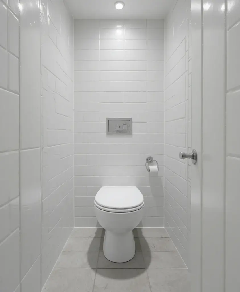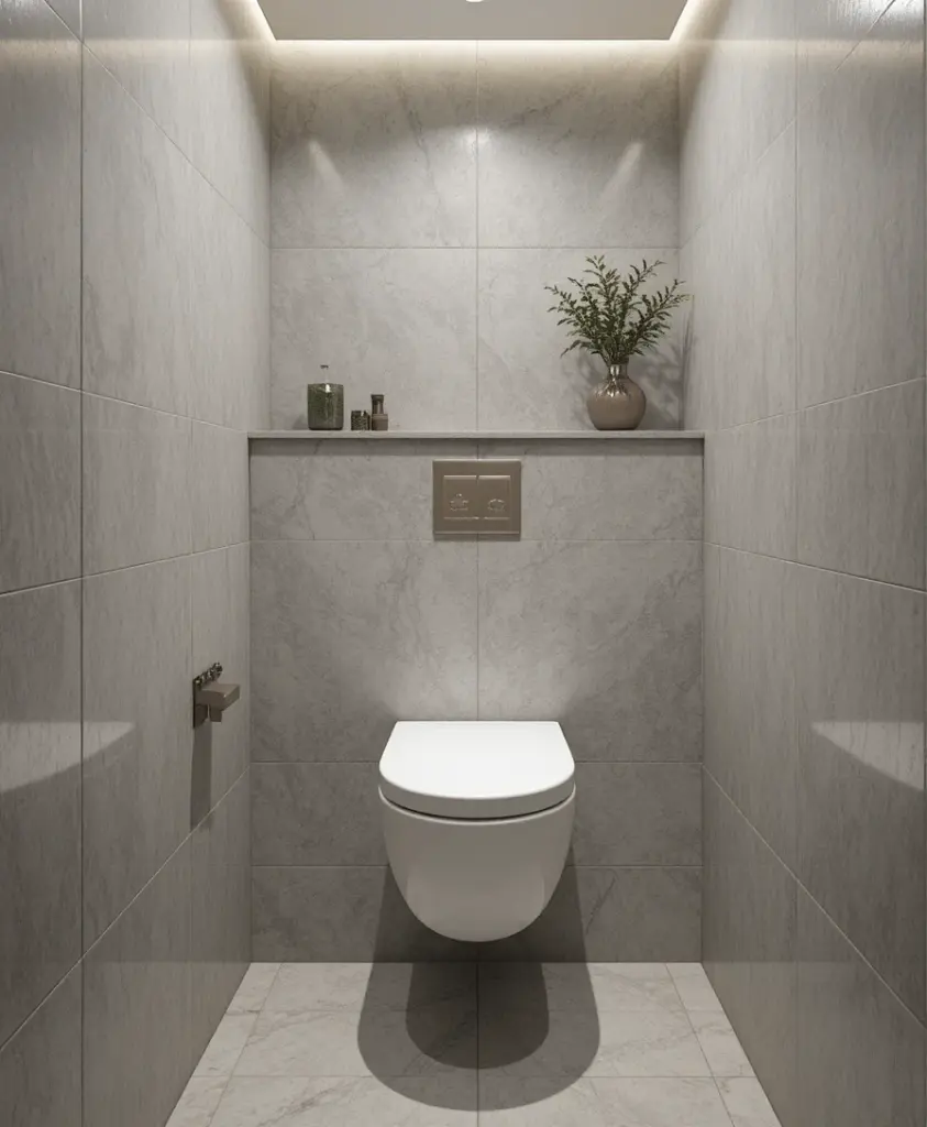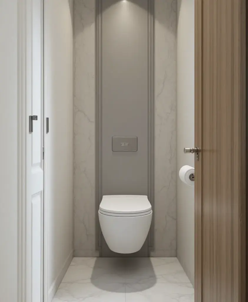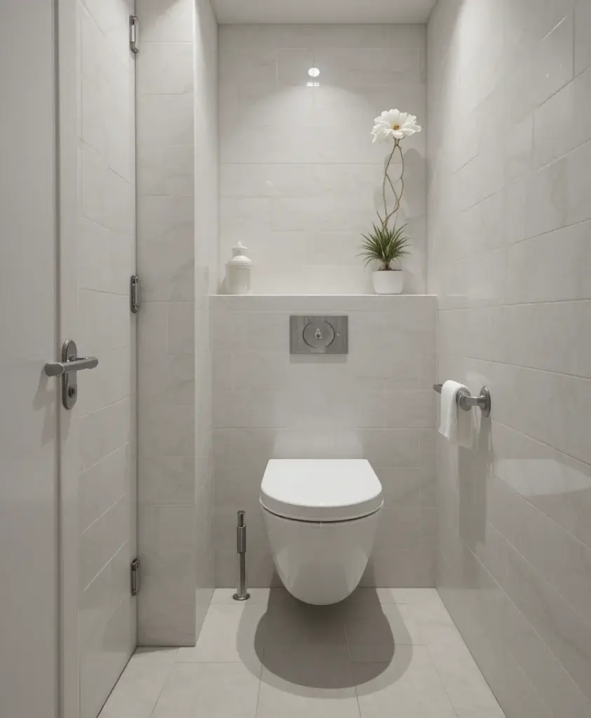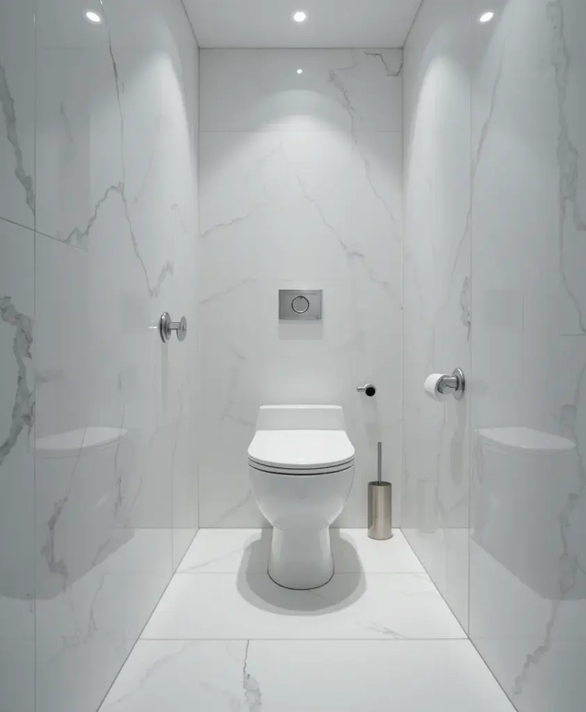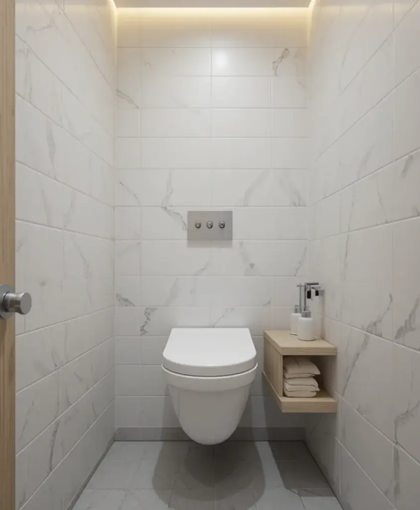 An ultra-compact toilet paired with an all-white palette creates the illusion of maximum space. Seamless finishes reduce visual breaks and keep the design clean. Subtle texture variations add depth without clutter. This is ideal for very tight bathrooms.
