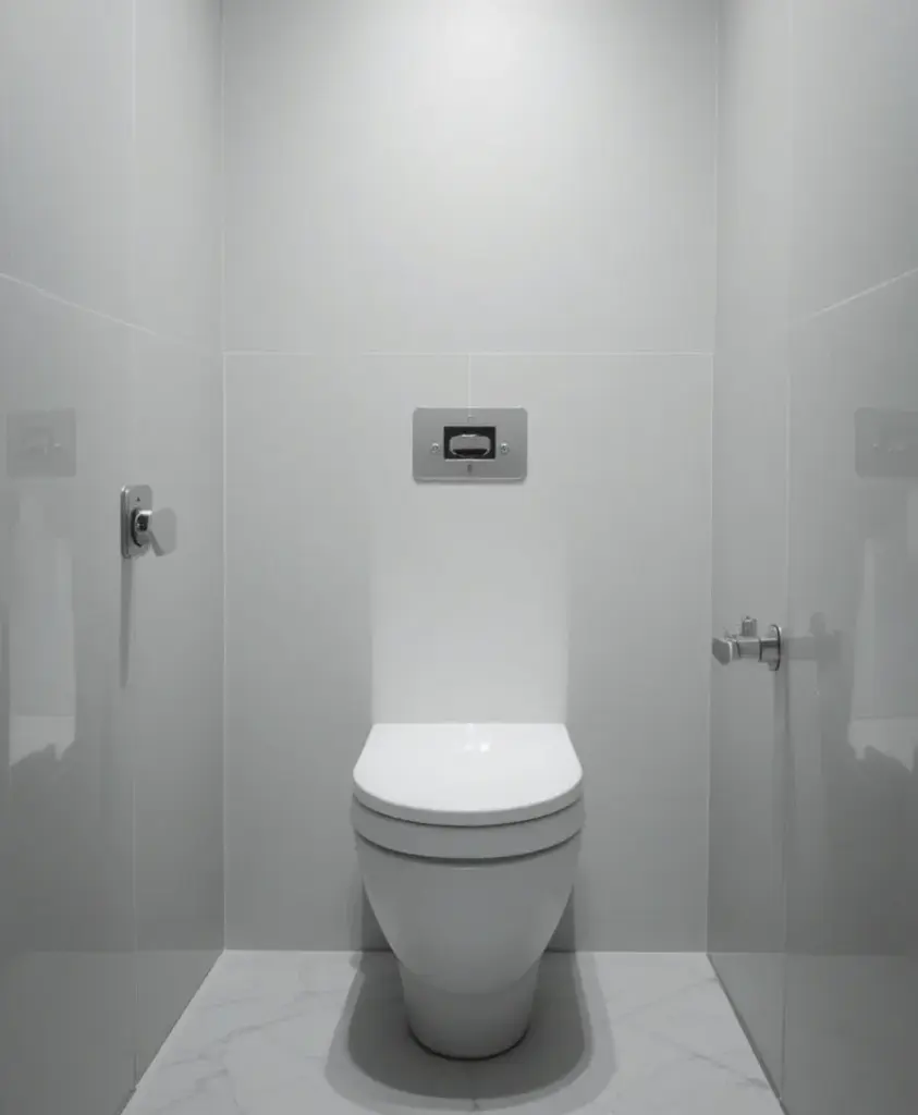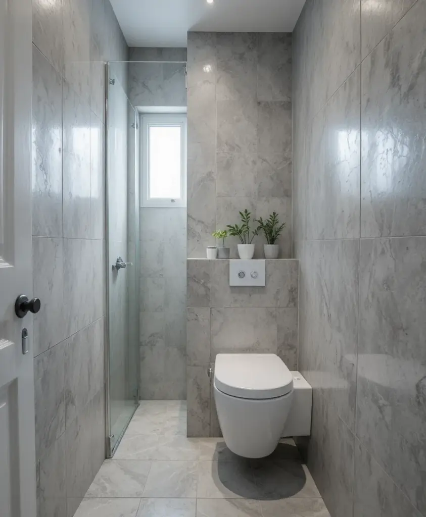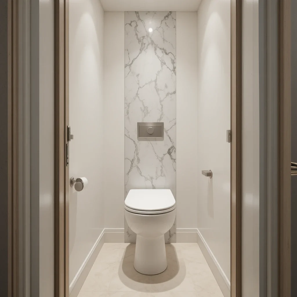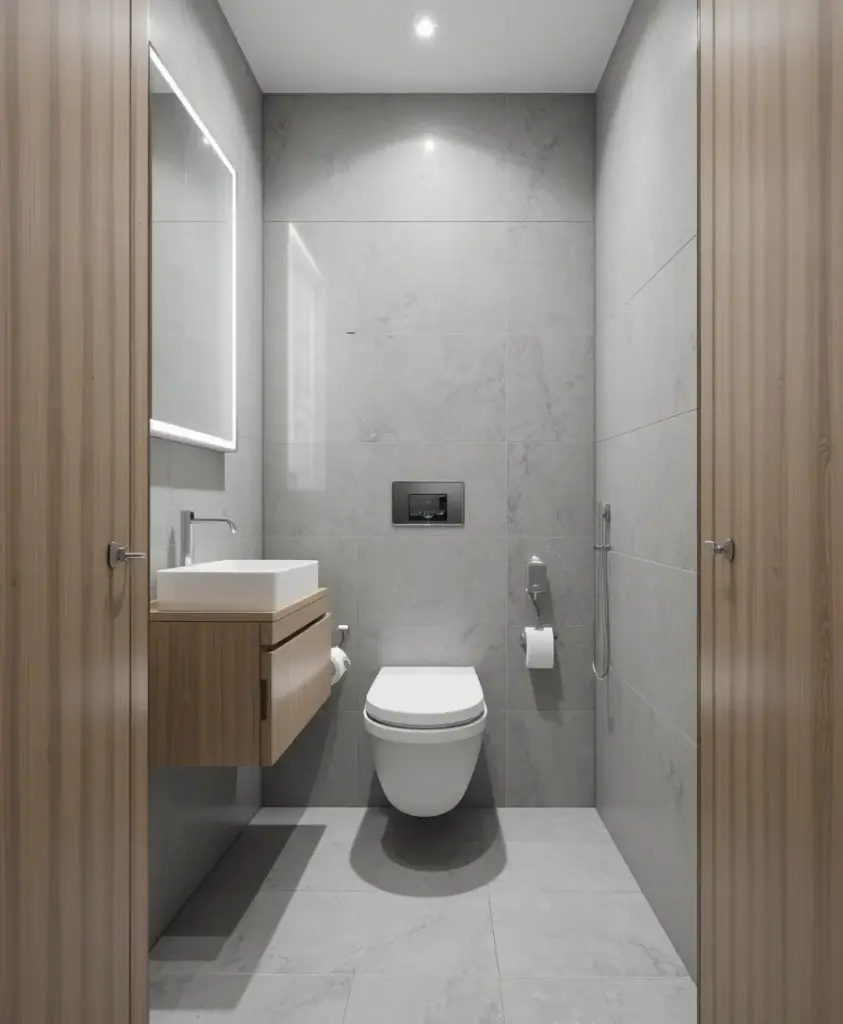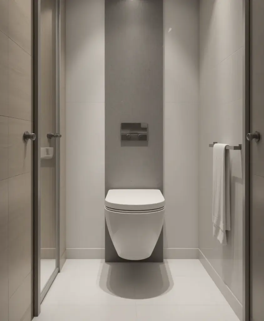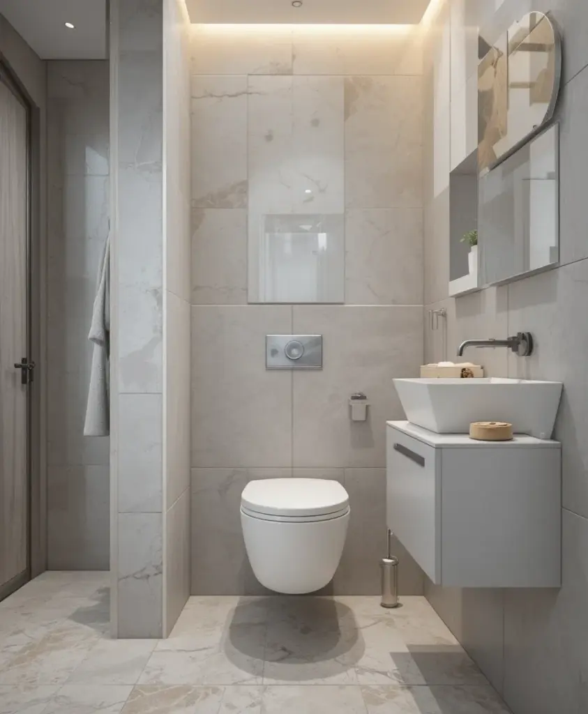 An ultra-compact toilet paired with an all-white palette creates the illusion of maximum space. Seamless finishes reduce visual breaks and keep the design clean. Subtle texture variations add depth without clutter. This is ideal for very tight bathrooms.