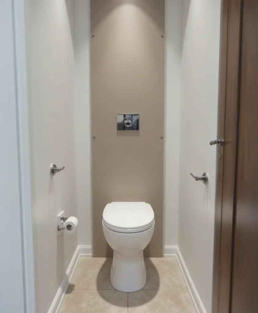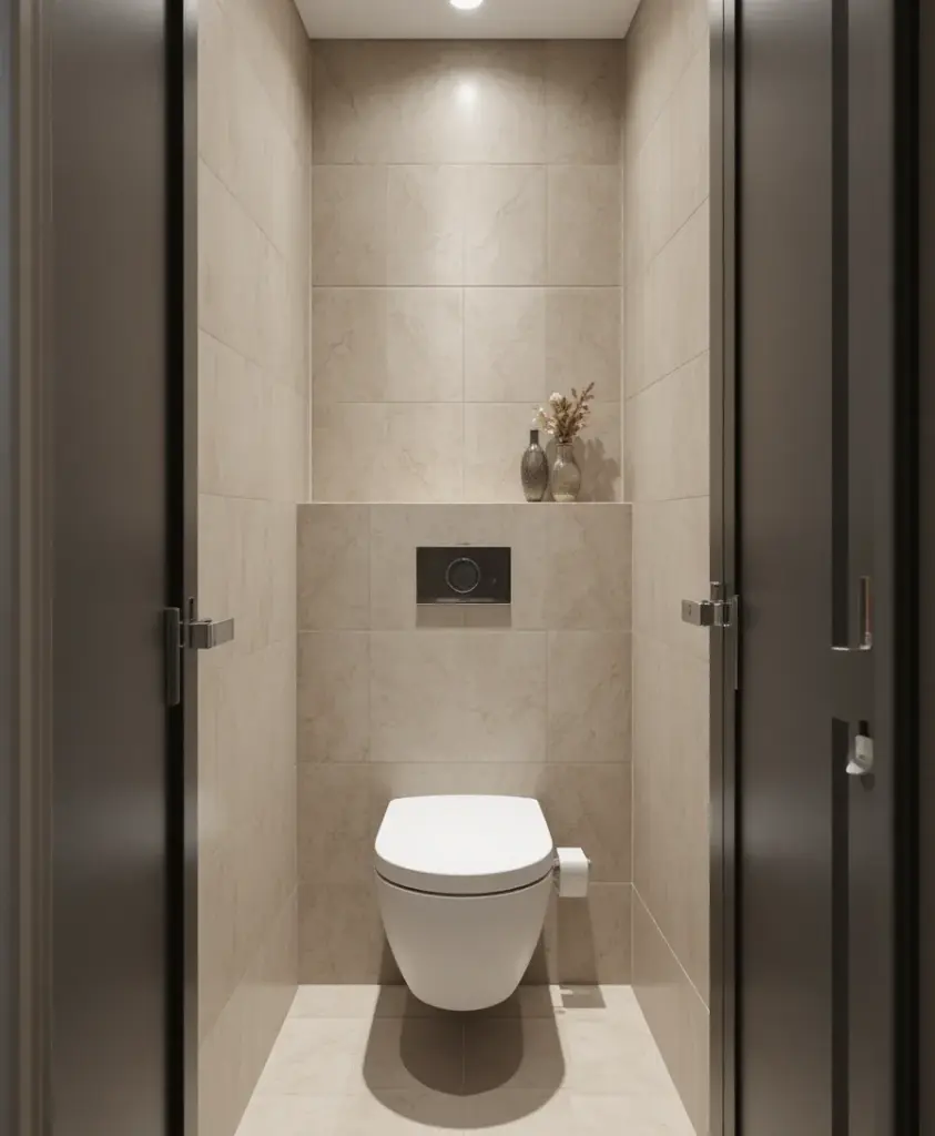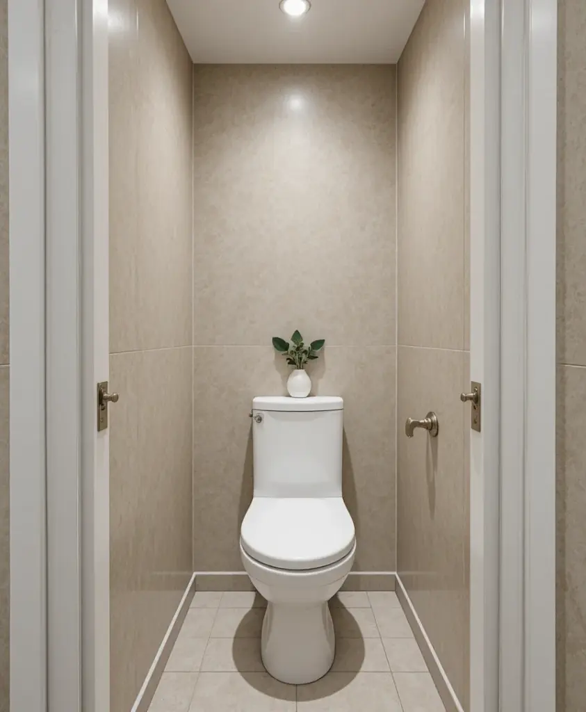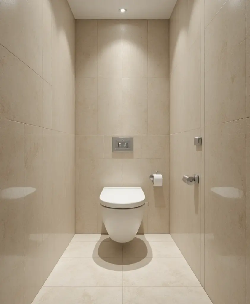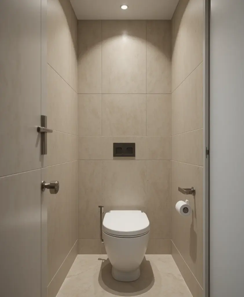 A slim toilet paired with soft neutral tones creates a calm and spacious feel. Beige, off-white, and warm gray tones reduce visual contrast. Minimal décor keeps the space uncluttered. This approach is ideal for very small bathrooms.