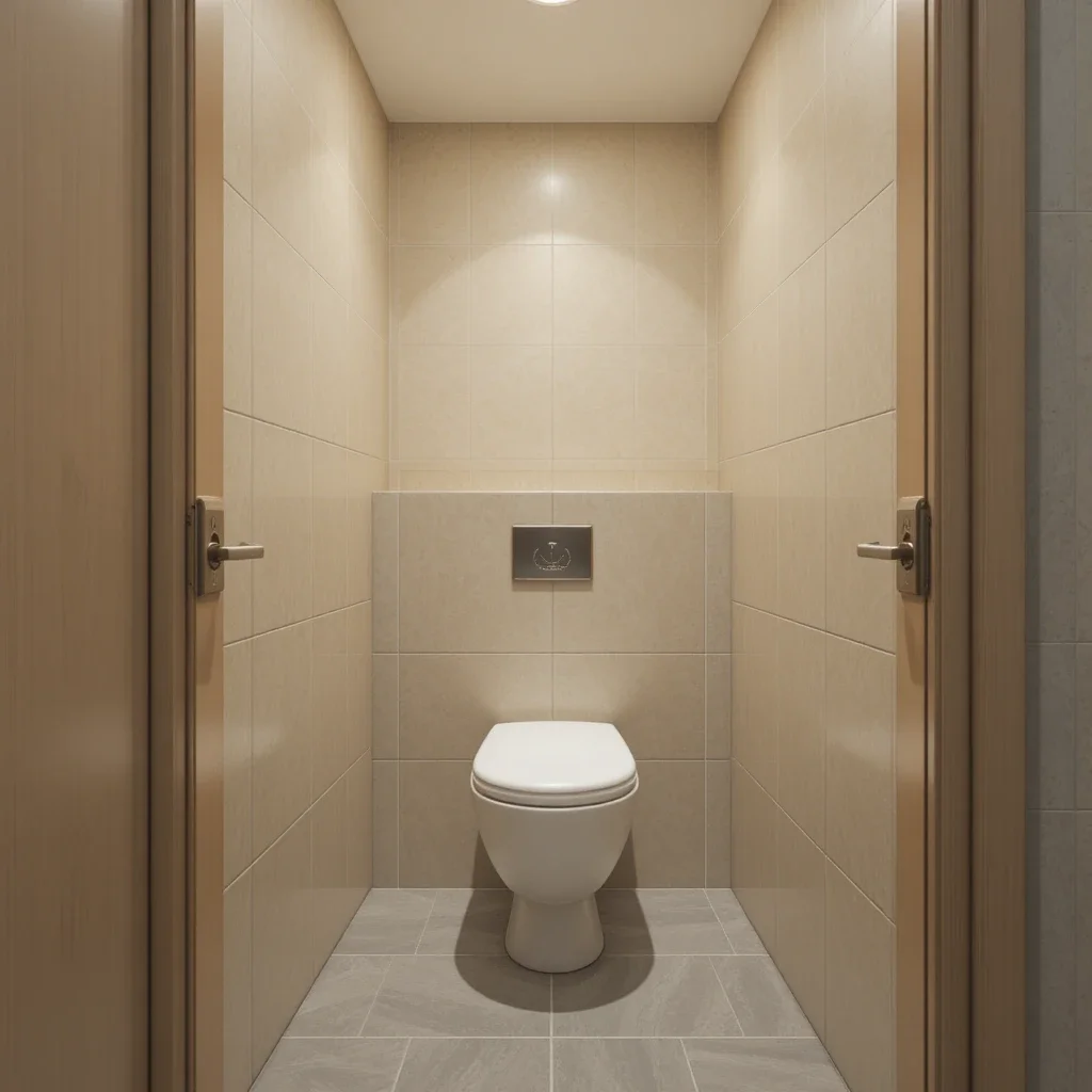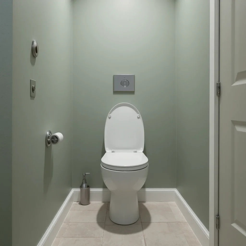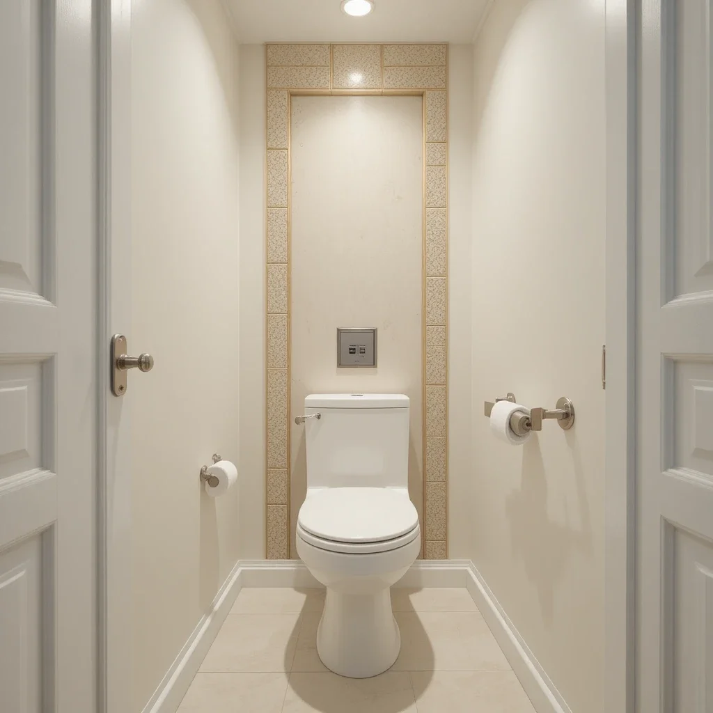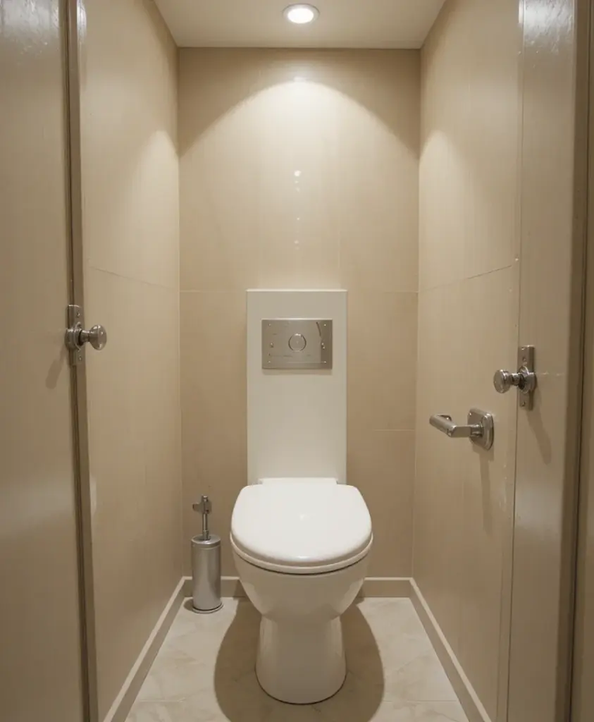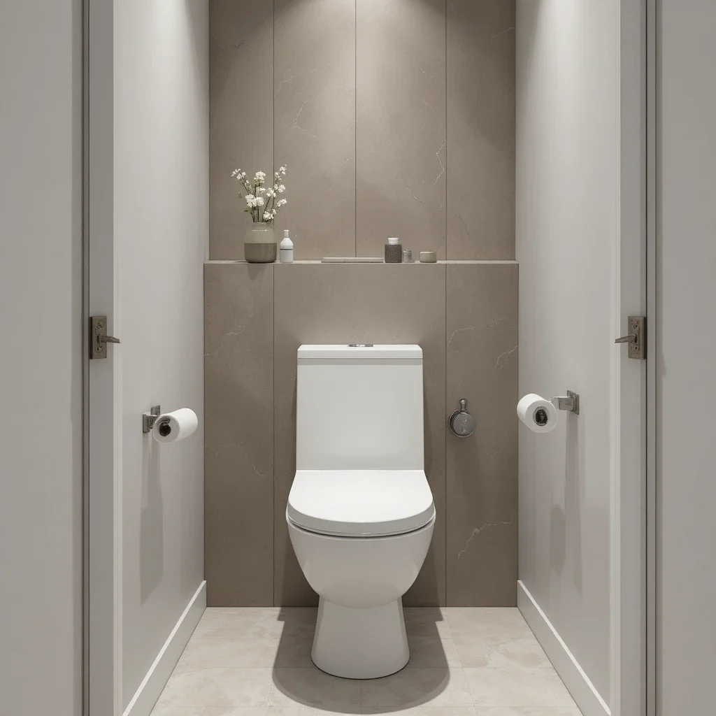 A slim toilet paired with soft neutral tones creates a calm and spacious feel. Beige, off-white, and warm gray tones reduce visual contrast. Minimal décor keeps the space uncluttered. This approach is ideal for very small bathrooms.