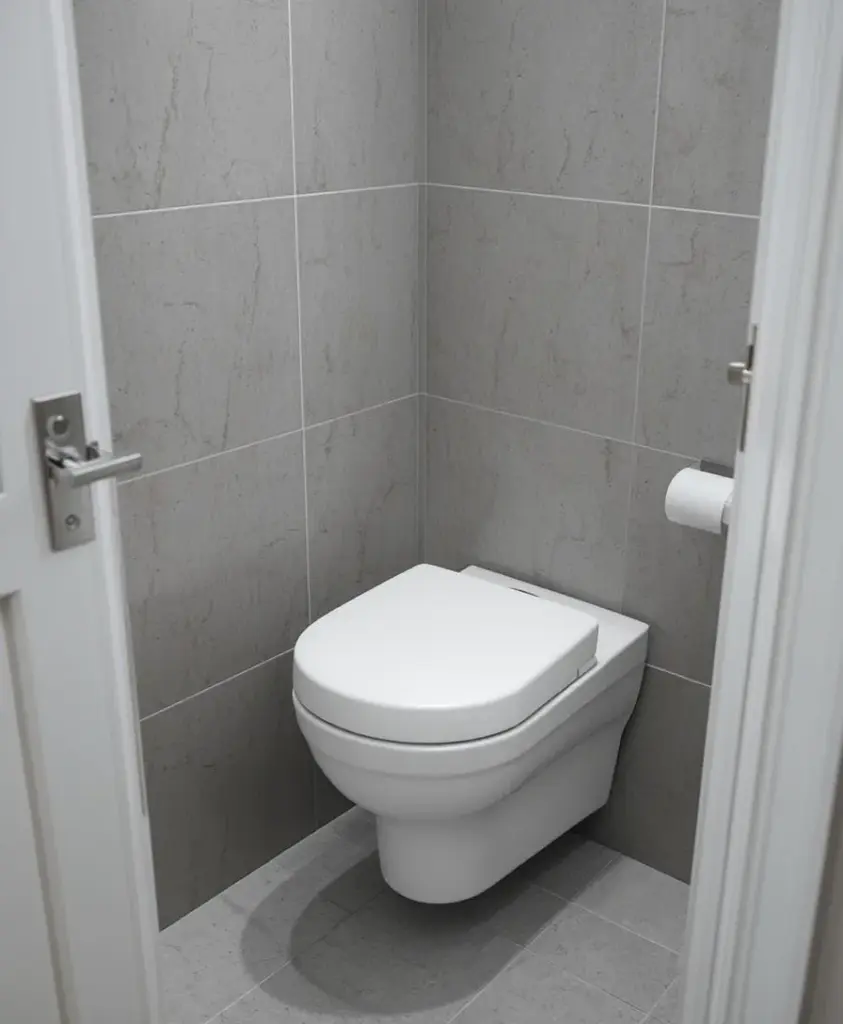 An ultra-compact toilet paired with clean white tiles creates a bright and spacious look. Minimal grout lines help reduce visual clutter. Simple finishes maintain a minimalist aesthetic. This works perfectly in very small bathrooms.