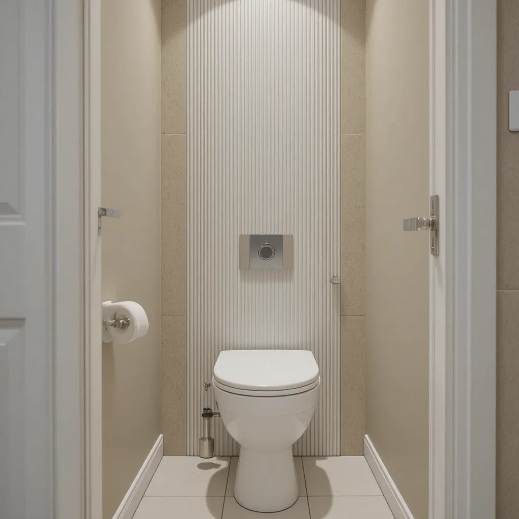A vertical fluted panel behind a compact toilet adds subtle texture while enhancing height. The ribbed detail creates visual interest without overwhelming the space. Soft neutral tones keep the bathroom feeling calm and open. This works beautifully in modern small bathrooms.