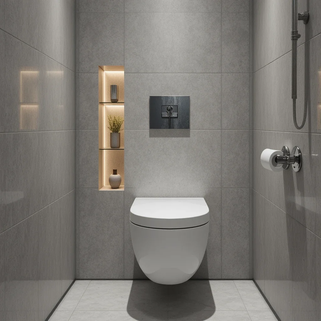 A slim vertical niche beside a wall-hung toilet provides storage without adding bulk. This built-in solution keeps toiletries organized while maintaining a clean look. Matching tile inside the niche ensures cohesion. Soft lighting enhances depth.