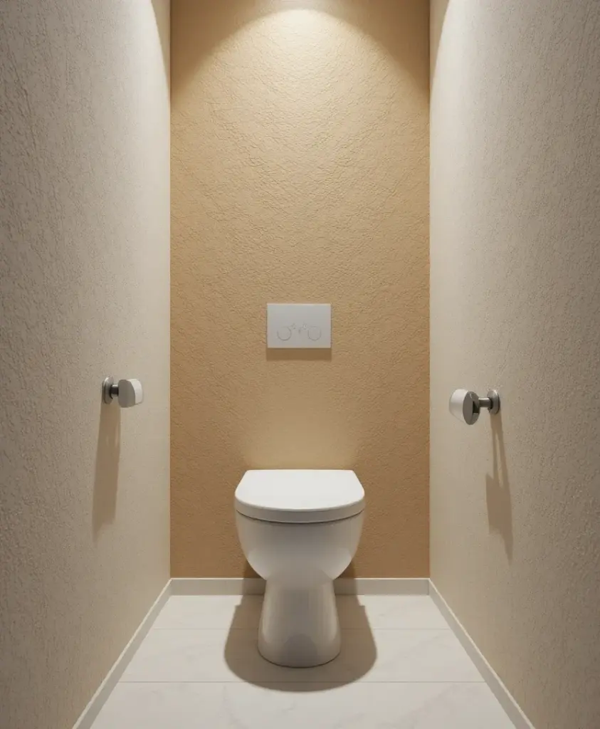 A textured paint accent behind a small toilet introduces subtle depth without using tiles. Soft tones like warm beige or pale gray keep the space calm. This approach is simple yet visually interesting. Minimal accessories complete the look.