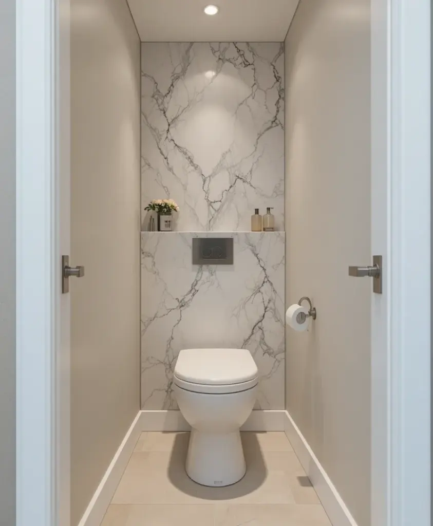 A back-to-wall toilet offers a compact footprint while keeping the design clean and streamlined. Pairing it with a marble feature wall behind the toilet creates a focal point without adding bulk. Light veining helps reflect light and enhance the feeling of space. Keep surrounding finishes simple for balance.