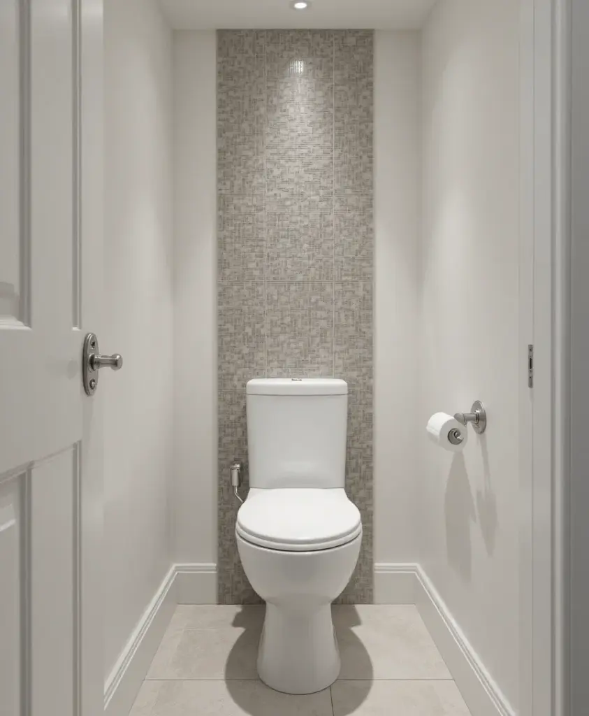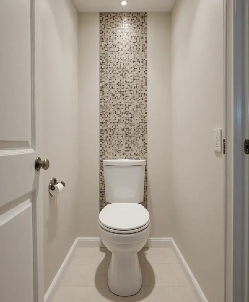 A vertical mosaic accent behind a compact toilet adds texture and a decorative focal point without overwhelming the small space. Slim mosaic strips draw the eye upward, helping the room feel taller. Keeping surrounding walls neutral ensures balance. This design works well in modern or contemporary bathrooms.