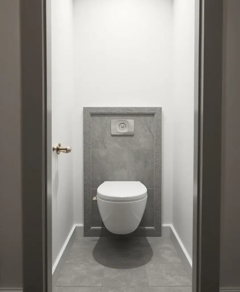 A vertical panel frame around a floating toilet creates a subtle focal area. Slightly contrasting tones add depth without overwhelming the space. The floating installation keeps the floor open. This idea suits contemporary bathrooms.