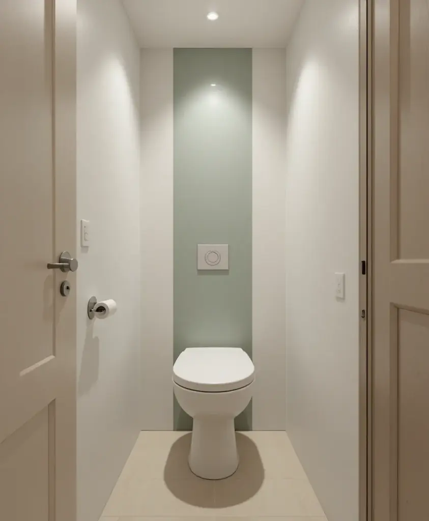 A vertical color block behind a small toilet creates a focal point and adds height illusion. Soft muted tones prevent the design from feeling busy. This approach is simple yet visually effective. Neutral flooring balances the look.