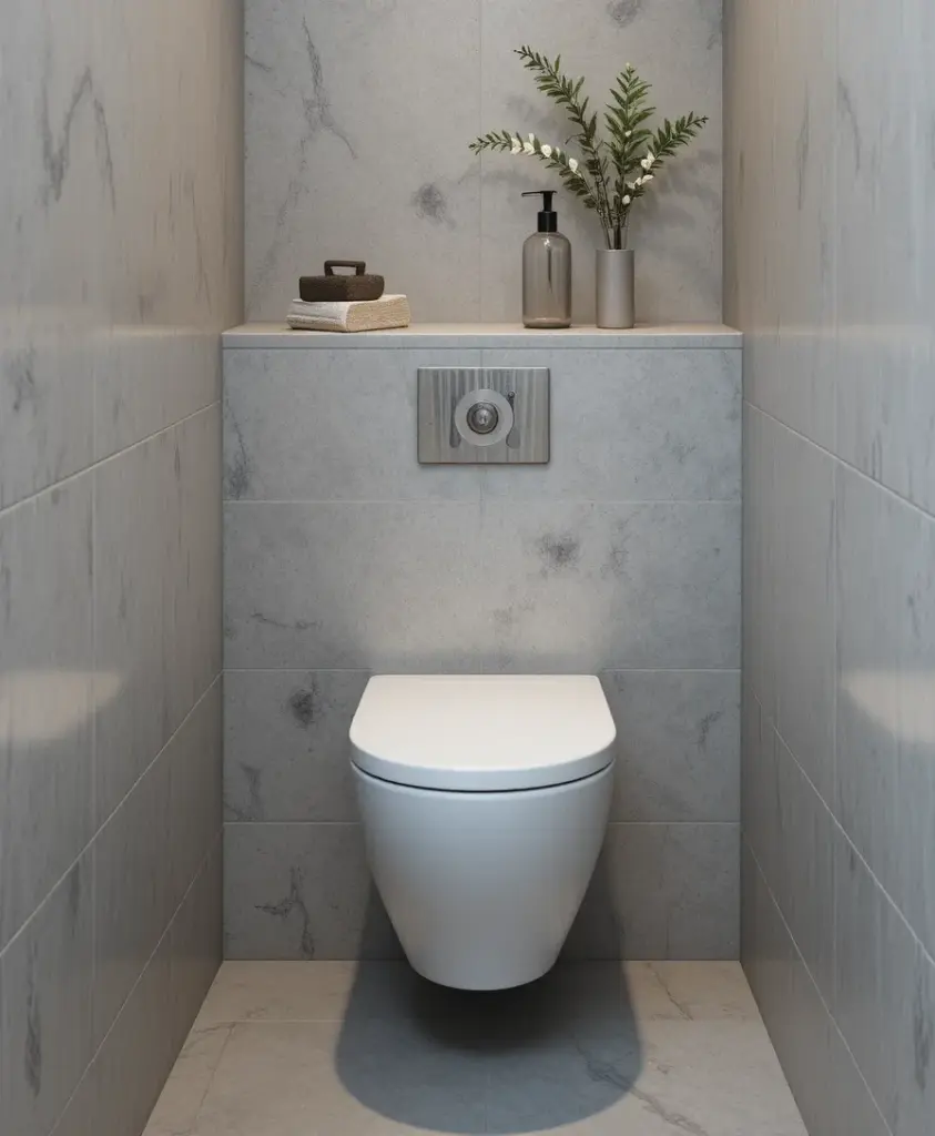 A light stone backdrop behind an ultra-compact toilet adds texture while keeping the space airy. Natural stone tones introduce warmth without heaviness. Minimal styling keeps the layout clean. This idea fits both modern and natural-inspired bathrooms.