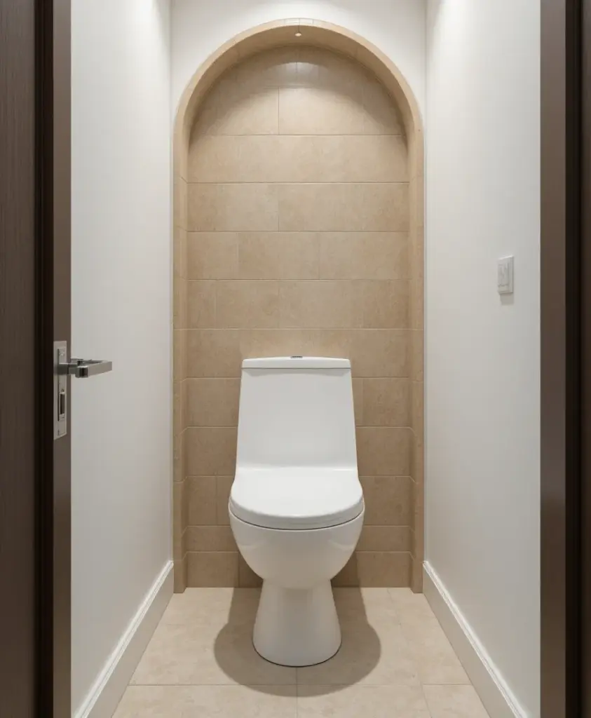 An arched tile backdrop behind a small toilet adds architectural softness. The curved shape contrasts with straight lines, making the space feel designed. Light neutral tiles keep the bathroom bright. This works beautifully in modern or Mediterranean styles.